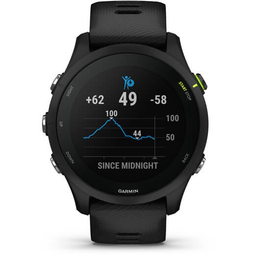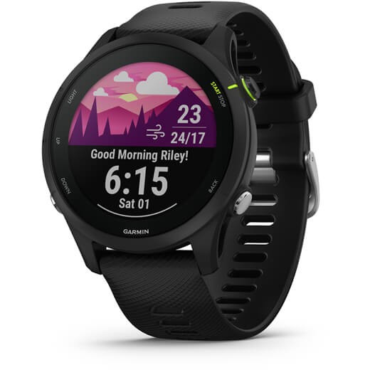 Garmin Forerunner 255 Music. Bildschirmdiagonale: 3,3 cm (1.3"), Bildschirmtechnologie: MIP, Display-Auflösung: 260 x 260 Pixel, Touchscreen. Flash-Speicher: 4 GB. WLAN. GPS. Gewicht: 49 g. Bandmaterial: Silikon, Armbandfarbe: Schwarz, Bandgröße: Universalgröße
