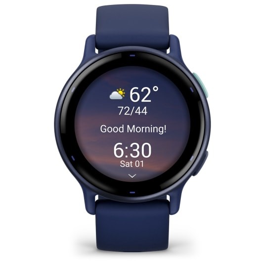 Garmin Vivoactive 5. Bildschirmdiagonale: 3,05 cm (1.2"), Bildschirmtechnologie: AMOLED, Display-Auflösung: 390 x 390 Pixel, Touchscreen. Flash-Speicher: 4 GB. WLAN. GPS. Gewicht: 36 g. Bandmaterial: Silikon, Armbandfarbe: Blau, Bandgröße: Universalgröße