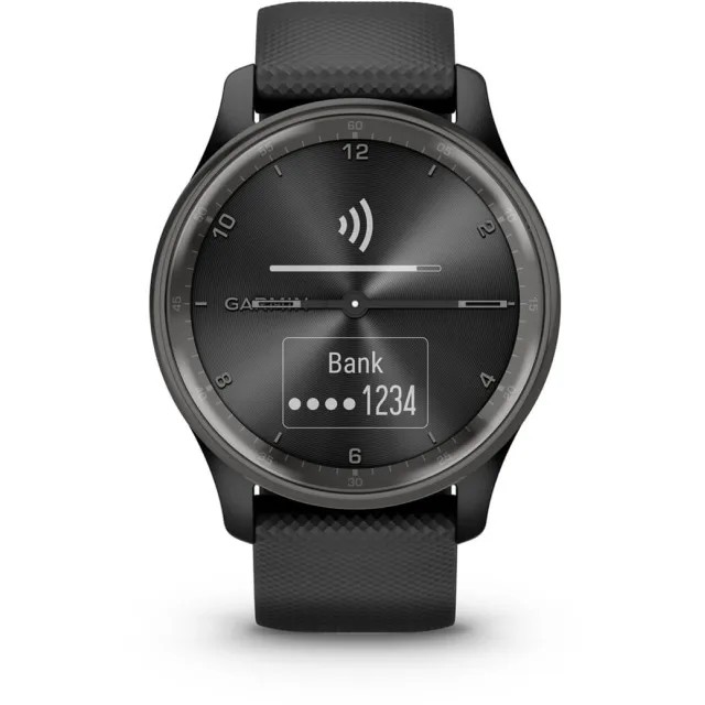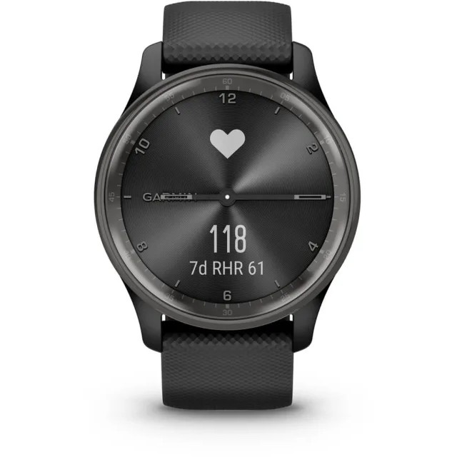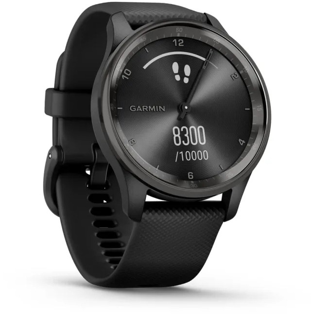 Garmin vivomove Trend. Bildschirmtechnologie: LCD, Display-Auflösung: 254 x 346 Pixel, Touchscreen. GPS. Gewicht: 28,3 g. Wasserdicht bis: 50 m, Bandmaterial: Silikon, Armbandfarbe: Schwarz