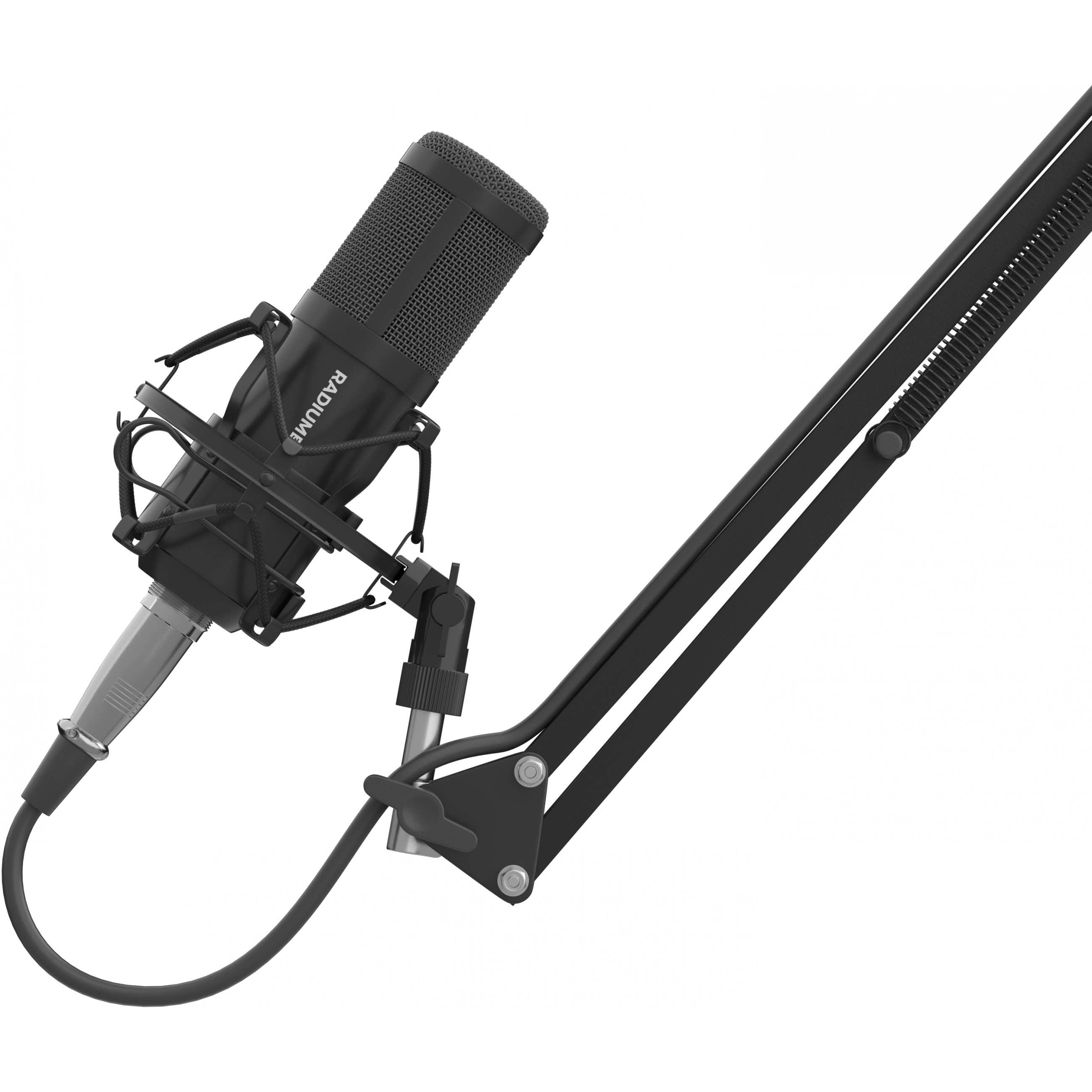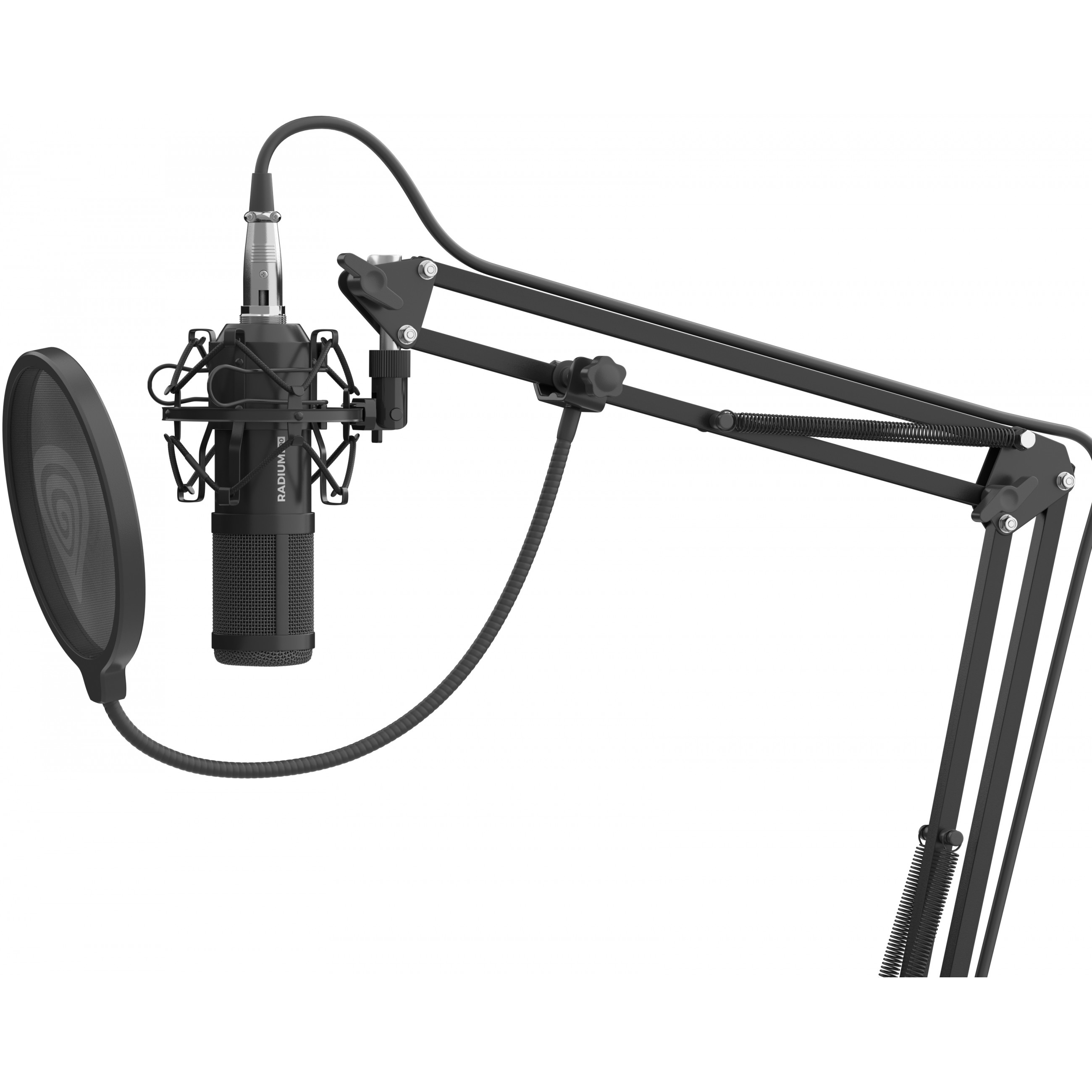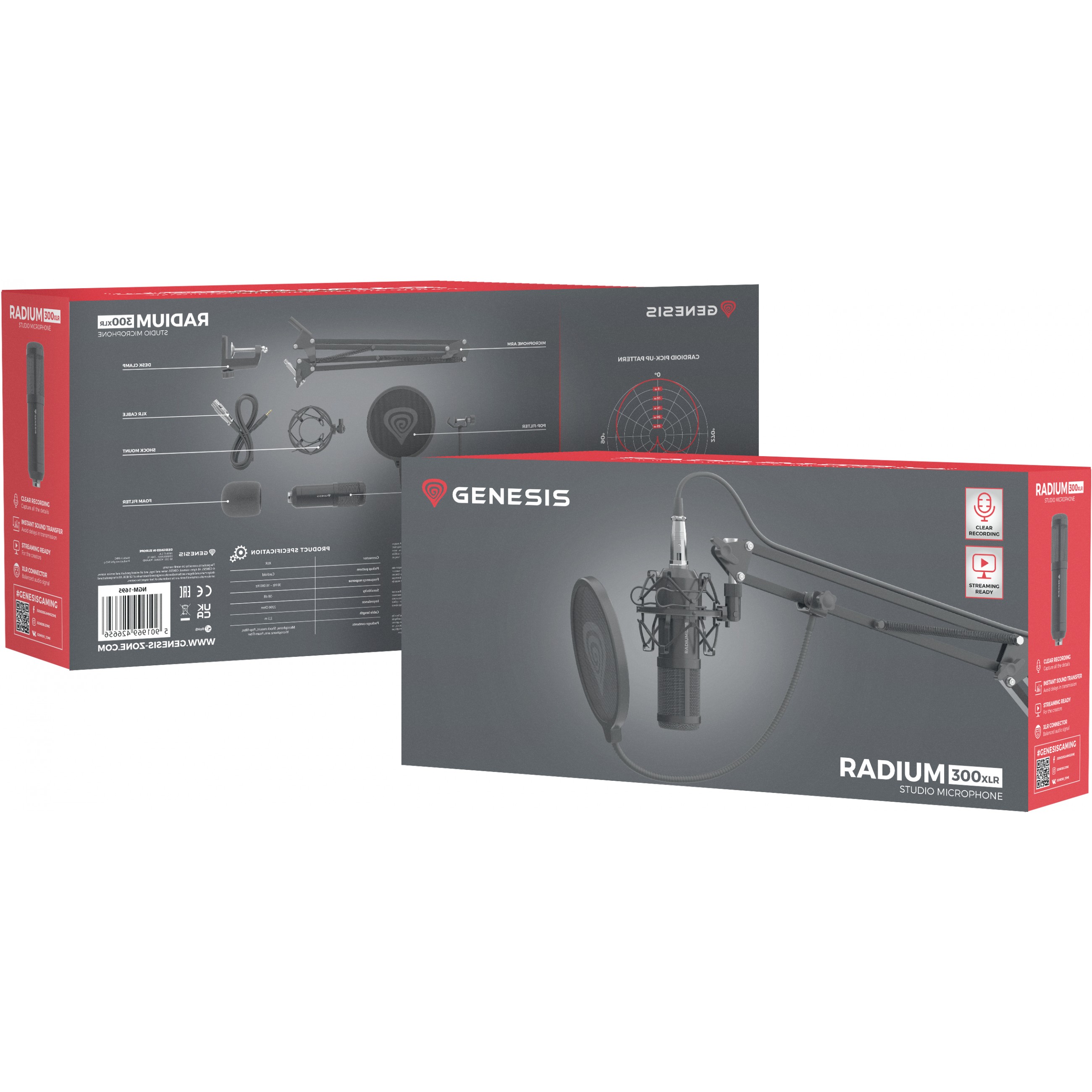 Vergiss die zusätzlichen Kosten. Wenn du dich für das Genesis Radium 300 XLR entscheidest, erhältst du nicht nur ein Mikrofon, sondern ein komplettes Set, das für seine Verwendung notwendig ist. Du findest einen Korb, der Vibrationen eliminiert, die sich negativ auf die Klangqualität auswirken können, einen Pop-Filter und einen Schwamm, um kompakte Konsonanten und Luftstöße zu unterdrücken, sowie einen Arm, der eine schnelle und dennoch professionelle Installation ermöglicht.