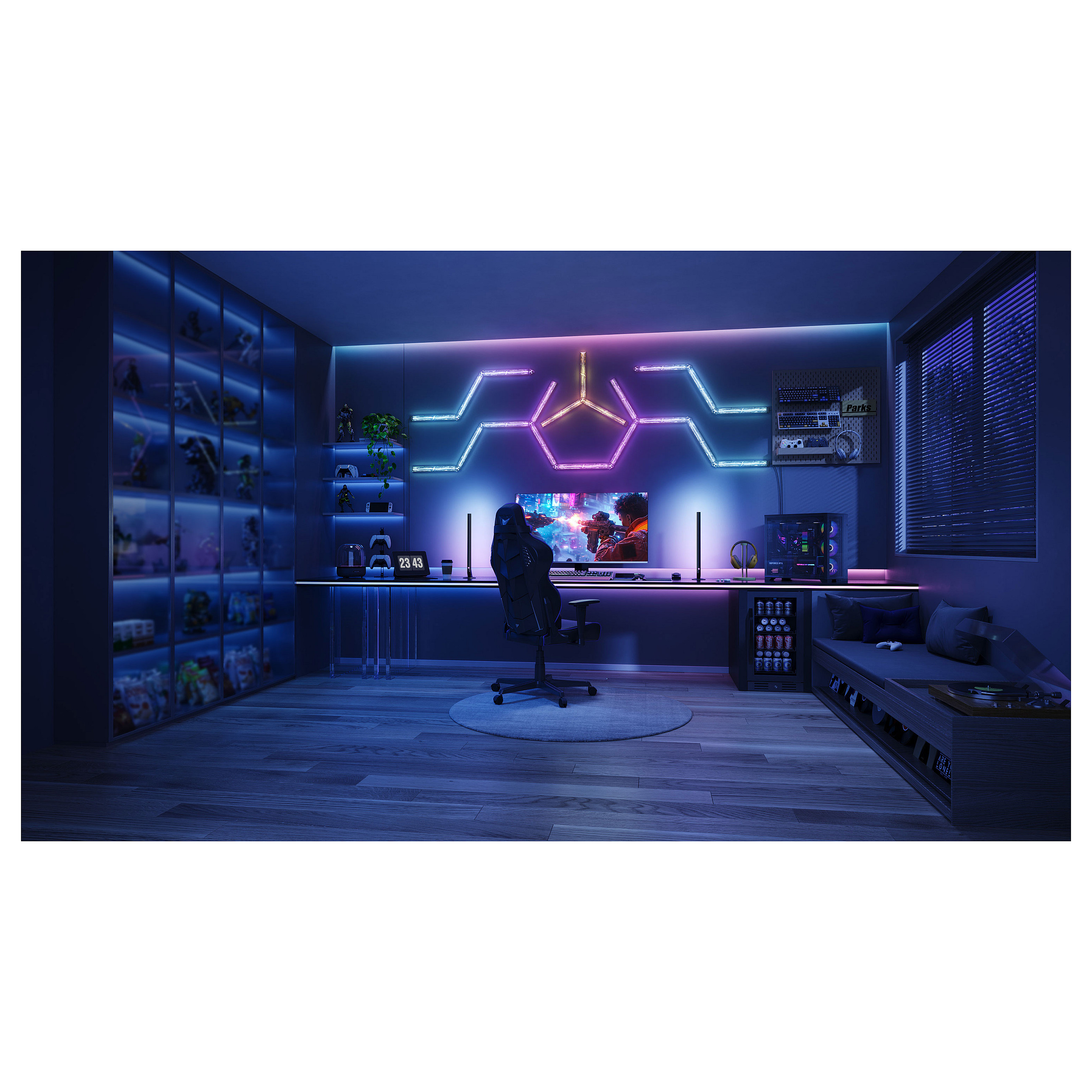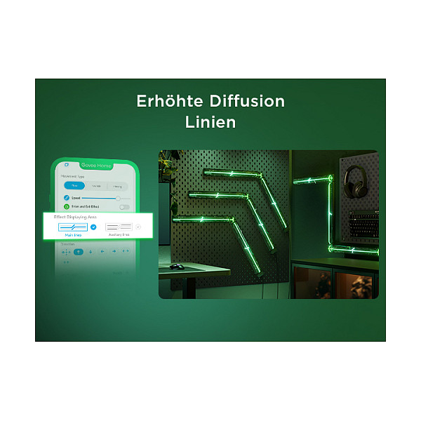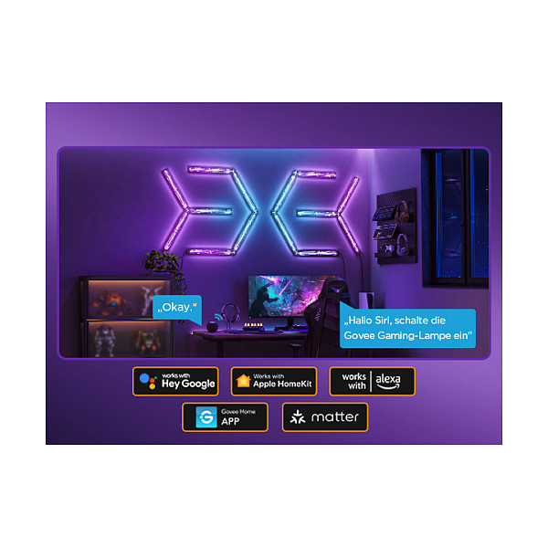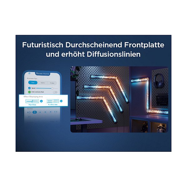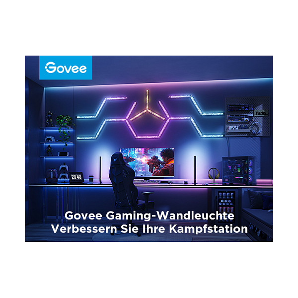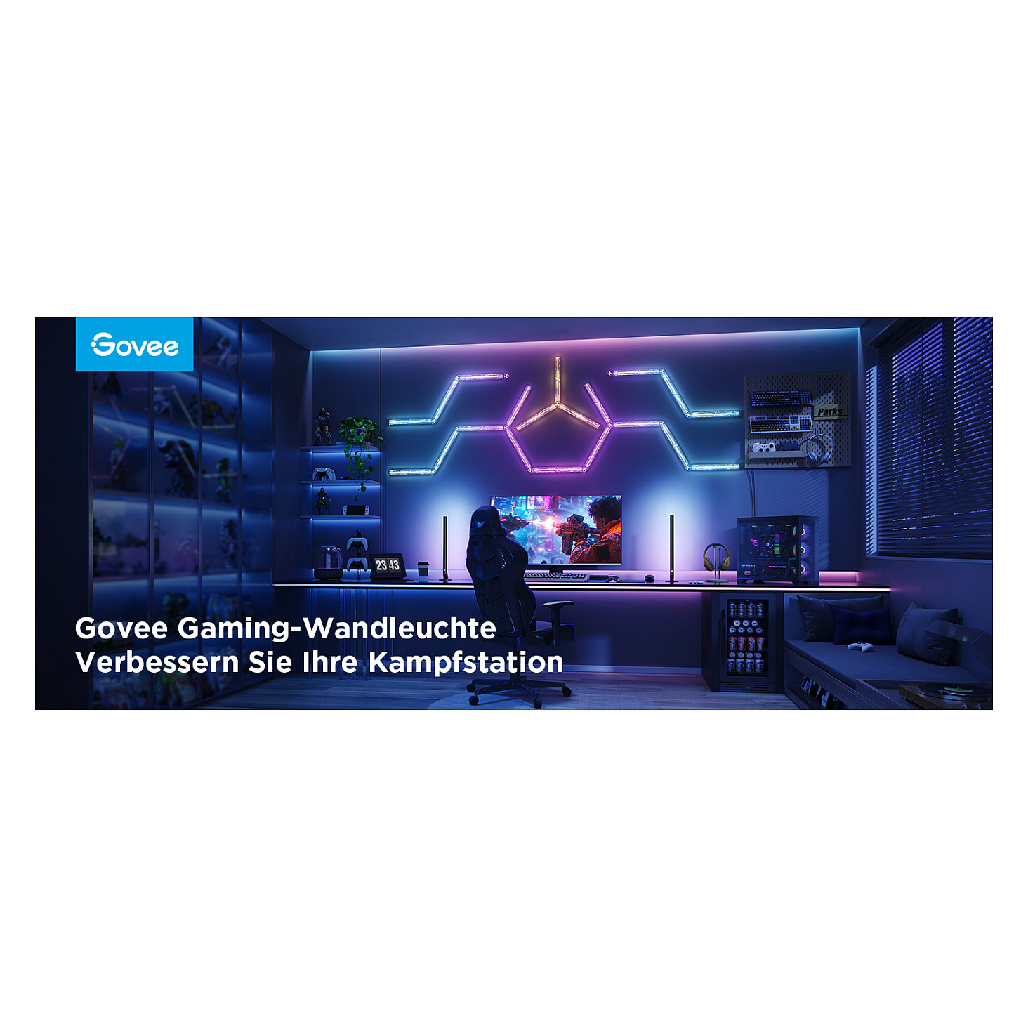 Govee H6063. Typ: Intelligente Wandleuchte, Schnittstelle: Wi-Fi/Bluetooth, Produktfarbe: Mehrfarbig. Energieeffizienzklasse: G, Energieverbrauch pro 1.000 Stunden: 15 kWh, Energieeffizienzskala: A bis G. Breite: 45 mm, Tiefe: 370 mm, Höhe: 30 mm. Verpackungsart: Box, Verpackungsbreite: 420 mm, Verpackungstiefe: 100 mm. Menge pro Packung: 4 Stück(e)