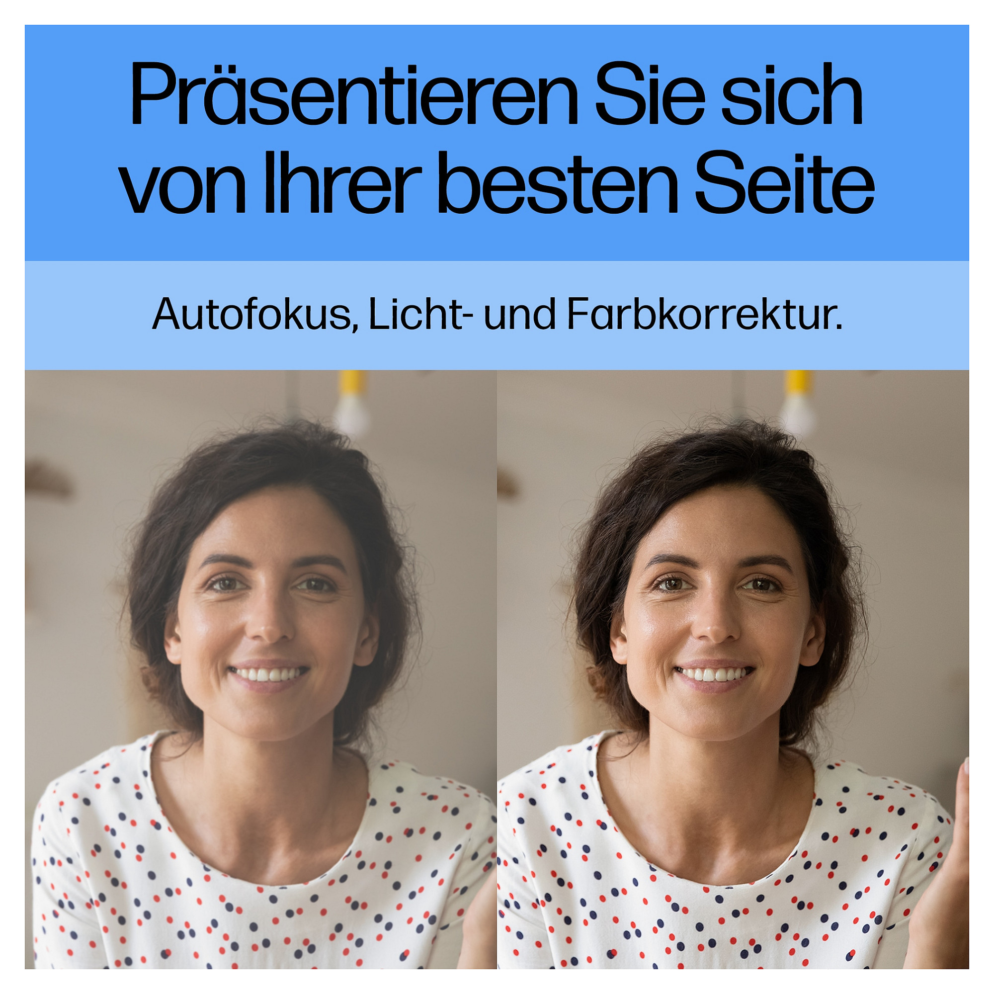 Lernen, unterrichten oder arbeiten Sie im Team als wären Sie persönlich vor Ort. Egal, wo Sie tatsächlich sind. Dank automatischem Fokus, Belichtungs- und Farbkorrektur können Sie einfach Sie selbst sein und sich auf die wichtigen Themen – statt auf Ihr Aussehen – konzentrieren. Diese Plug-and-Play-Webcam verfügt über zwei Mikrofone, die Hintergrundgeräusche unterdrücken, sodass Sie das Zentrum der Aufmerksamkeit bleiben und immer und überall gut zu hören sind.