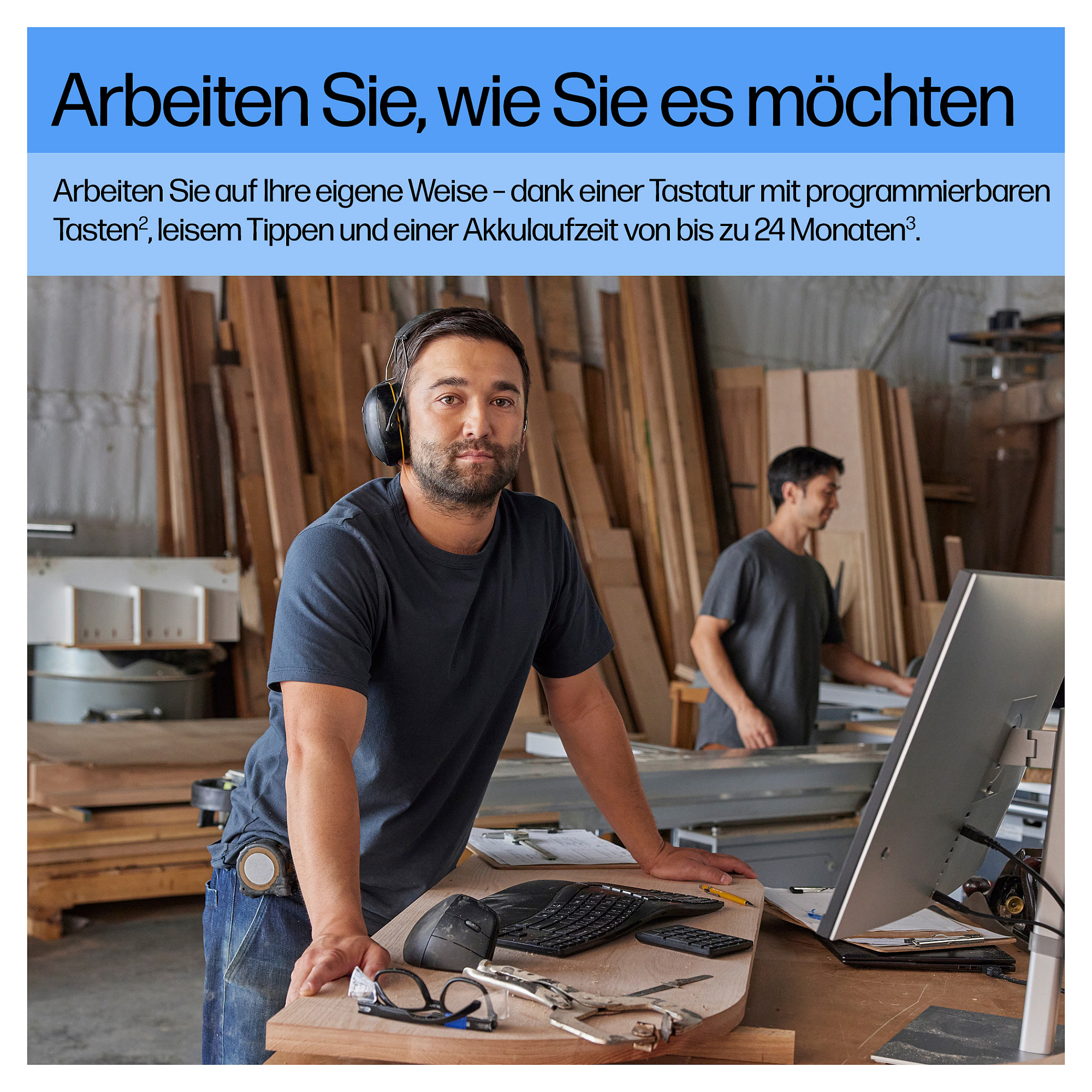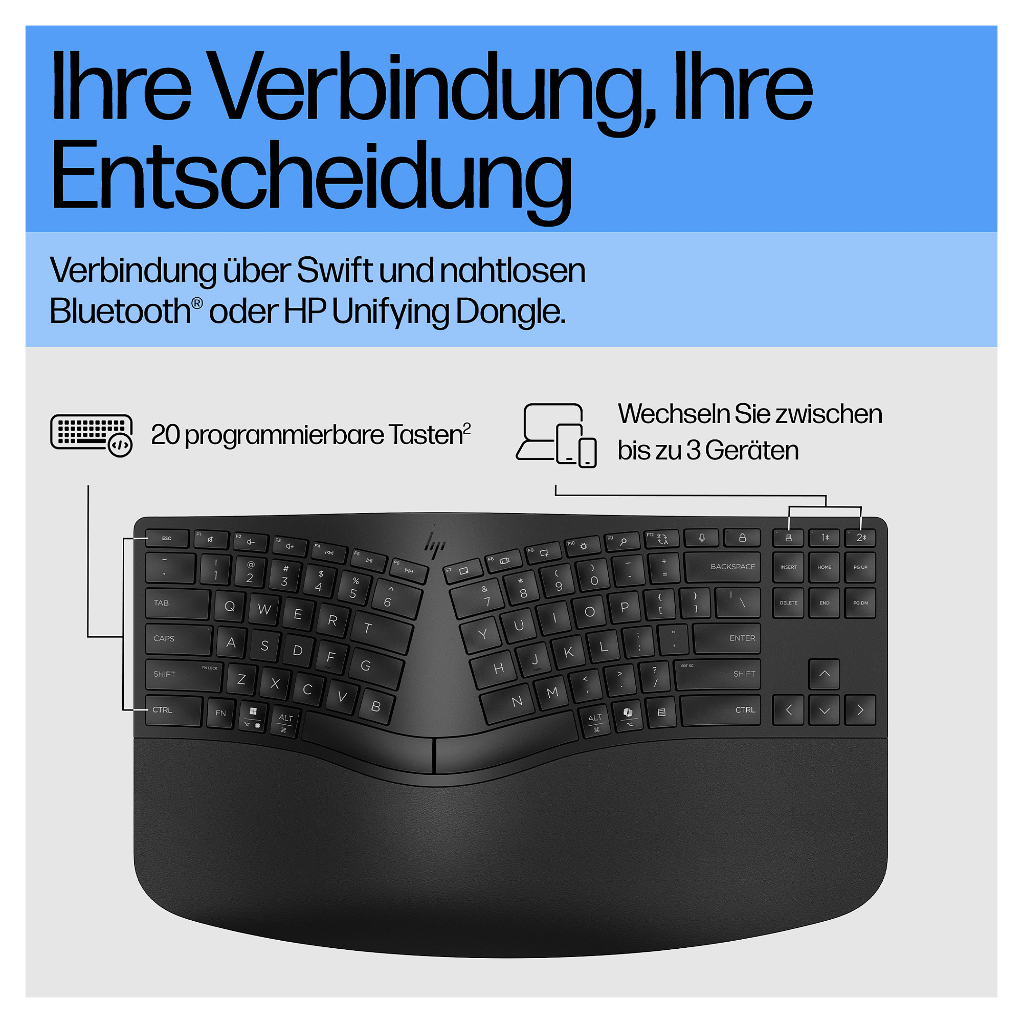 Bauen Sie Ihren perfekten Arbeitsbereich auf, mit der wissenschaftlich entwickelten ergonomischen Wireless-Tastatur von HP. Das geteilte Design passt sich Ihrer Körperhaltung an, und zwanzig programmierbare Tasten[1] sowie ein separater Ziffernblock bieten optimale individuelle Konfigurationsmöglichkeiten. Und dank zwei Möglichkeiten, Geräte zu verbinden, können Sie sicher sein, stets mit den richtigen Tools zur Bewältigung Ihrer Aufgaben ausgestattet zu sein.