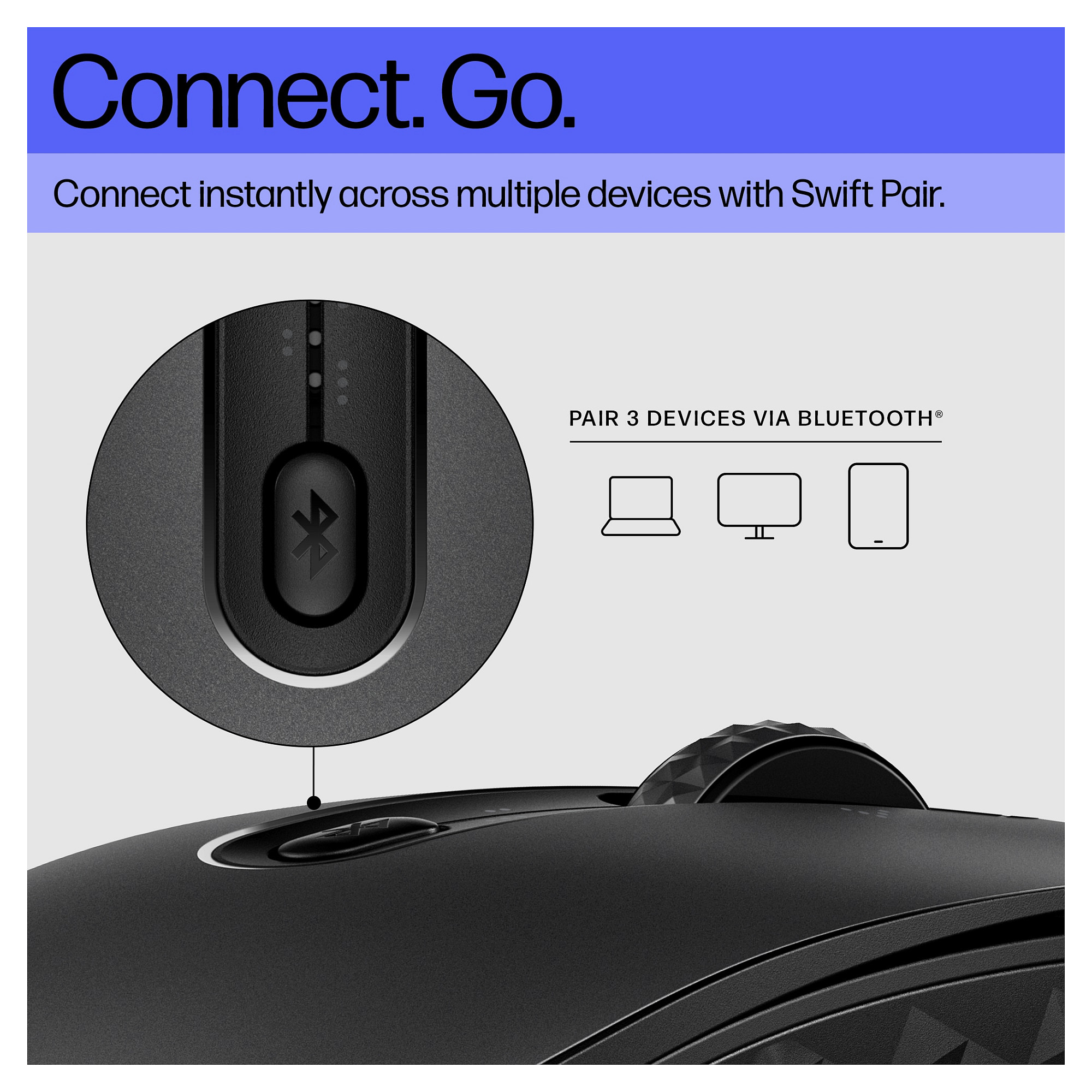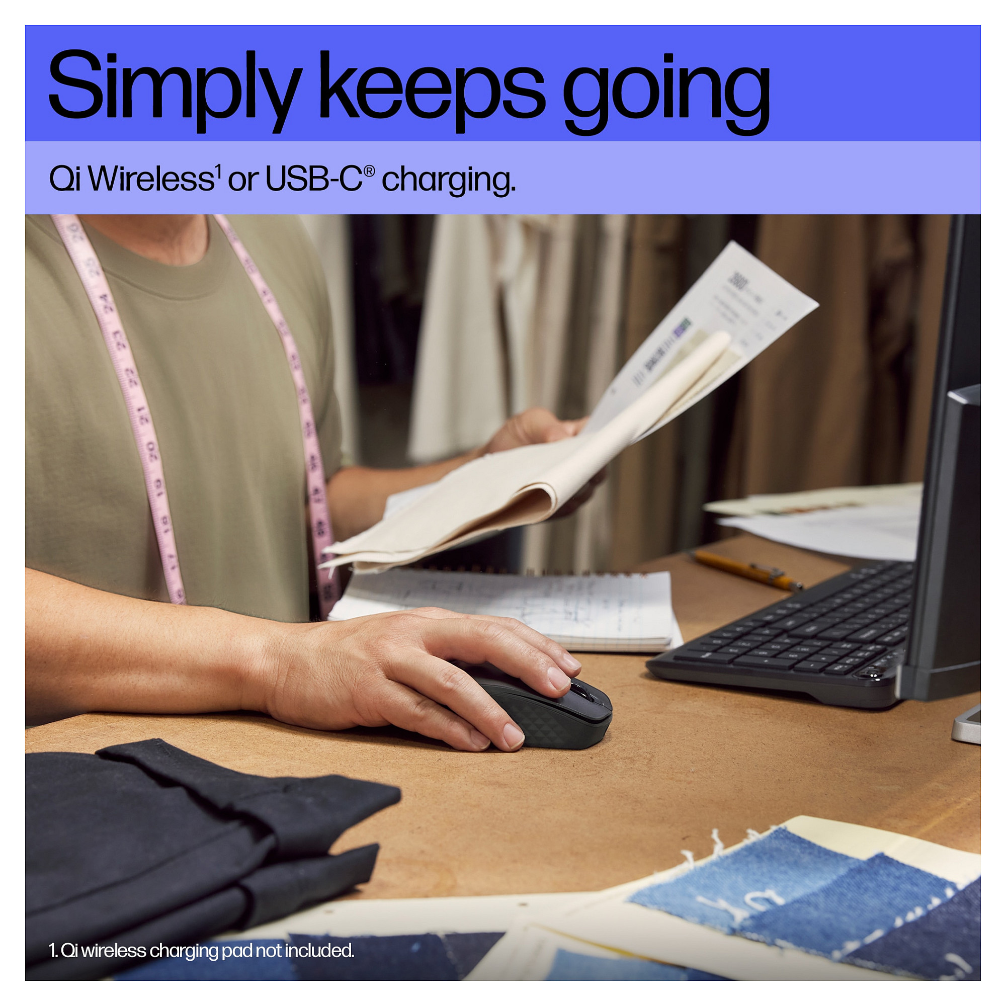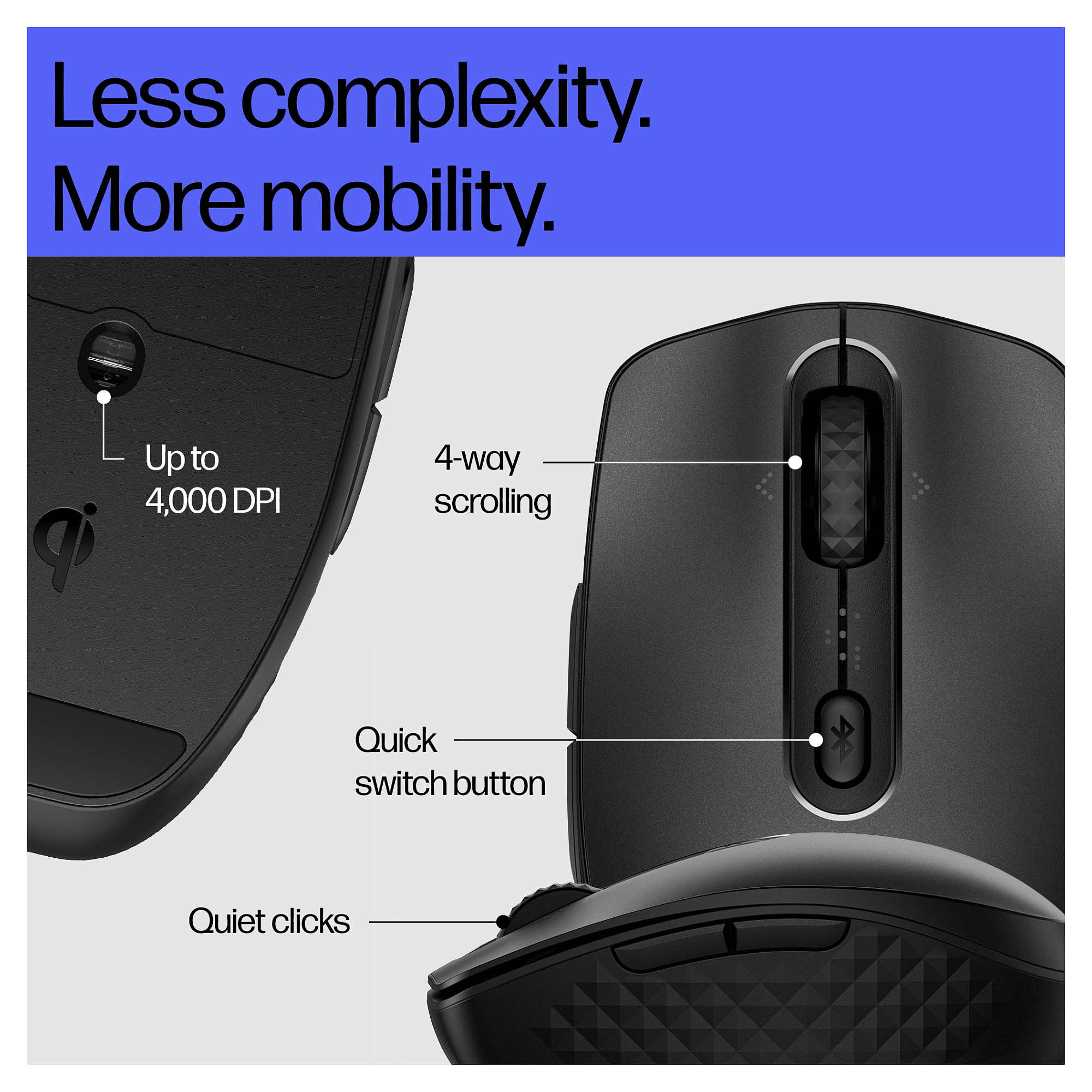 Überall arbeiten und dabei trotzdem laden – mit einer praktischen und mobilen Bluetooth®-Maus. Verabschieden Sie sich dank der Qi-Wireless-Ladefunktion[2] und einer langen Akkulaufzeit vom Chaos mit den Ladegeräten. Außerdem unmittelbare und nahtlose Konnektivität für bis zu drei Geräte dank einfacher individueller Einstellung über sechs programmierbare Tasten[1].