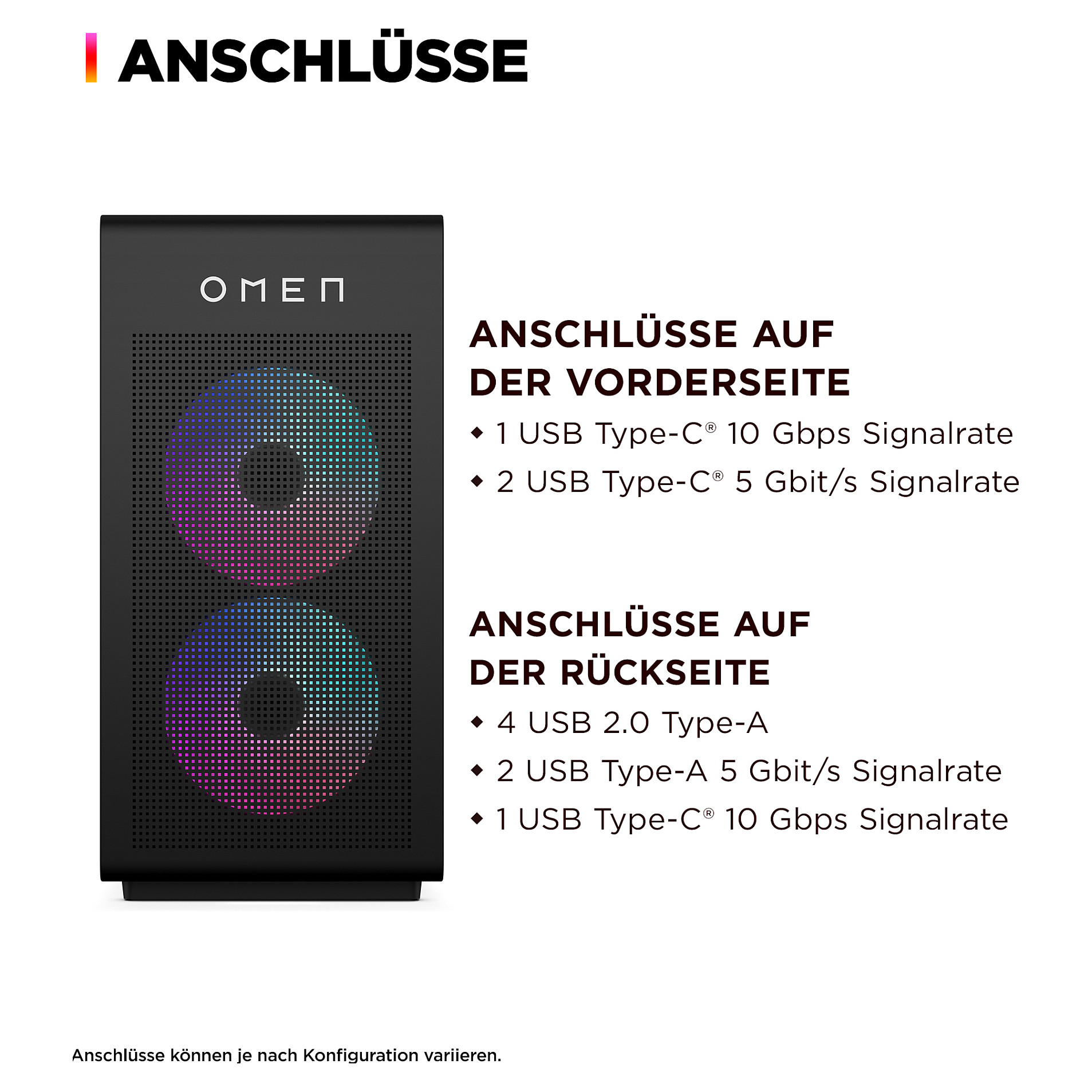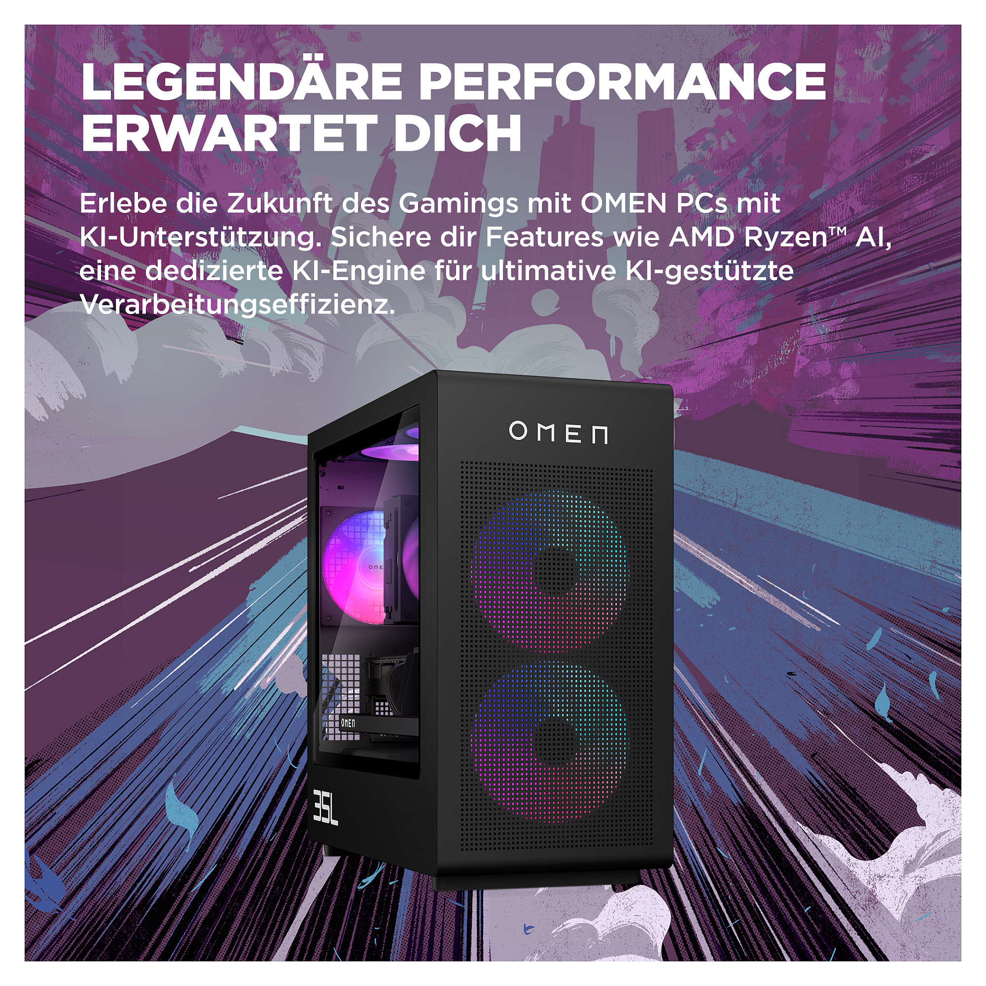 Der OMEN 35L Gaming-Desktop-PC ermöglicht es dir, dein gesamtes Leistungspotenzial zu nutzen. Neben dem neuesten AMD Ryzen™ Prozessor[1] und fortschrittlicher Grafik ist er mit speziellen OMEN Markenkomponenten ausgestattet, die für starke Kühlung und hohe Leistung unter Spitzenlast ausgelegt sind. Das Design erlaubt eine einfache Aufrüstungen und Personalisierungen ohne Werkzeug, so dass du ihn problemlos an deine Gaming-Anforderungen anpassen kannst.