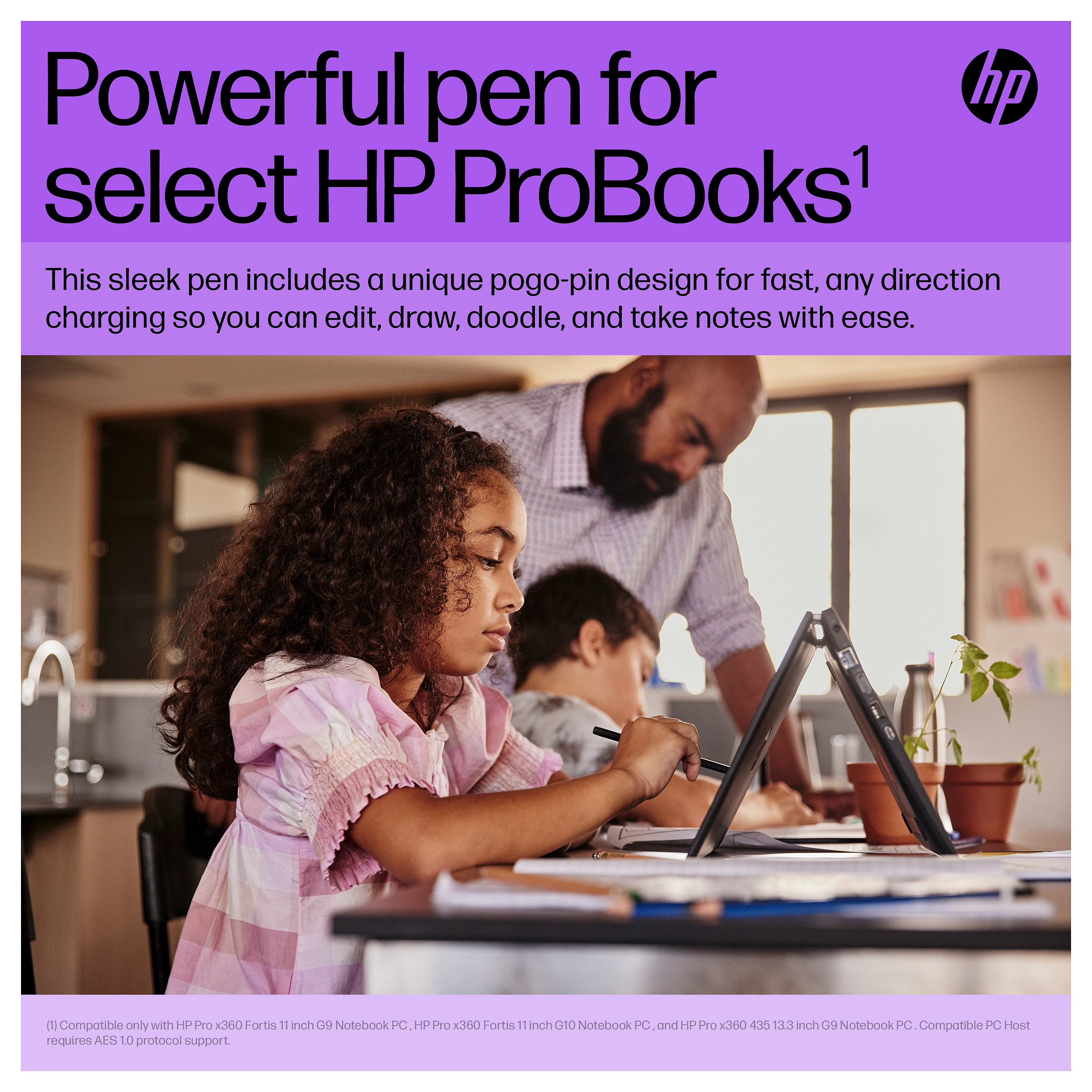 Dieser kompakte Stylus ist nur mit ausgewählten HP ProBooks der Bildungsedition kompatibel.[1] Für schnelles allseitiges Aufladen ist er als einzigartiges Prüfpin-Modell konzipiert. So können Sie arbeiten und zeichnen, herum kritzeln und sich Notizen machen als hätten Sie einen herkömmlichen Stift in der Hand – nur intelligenter. Das schicke Design lädt außerdem dazu ein, den Stift überall dabei zu haben.