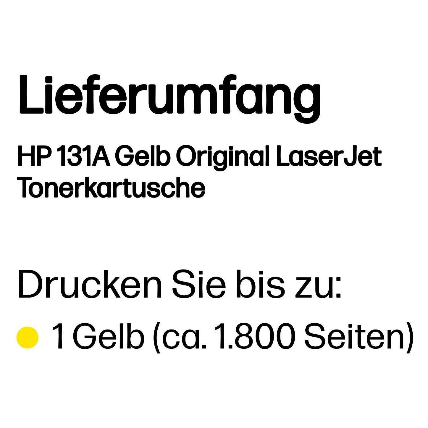 Die HP 131A LaserJet Tonerkassette gelb liefert Dokumente und Marketingmaterialien in professioneller Qualität – ob im Home-Office oder im Unternehmen. Vermeiden Sie Zeit- und Materialverschwendung und arbeiten Sie jederzeit produktiv. Die Kassetten wurden speziell auf Ihren Drucker abgestimmt.