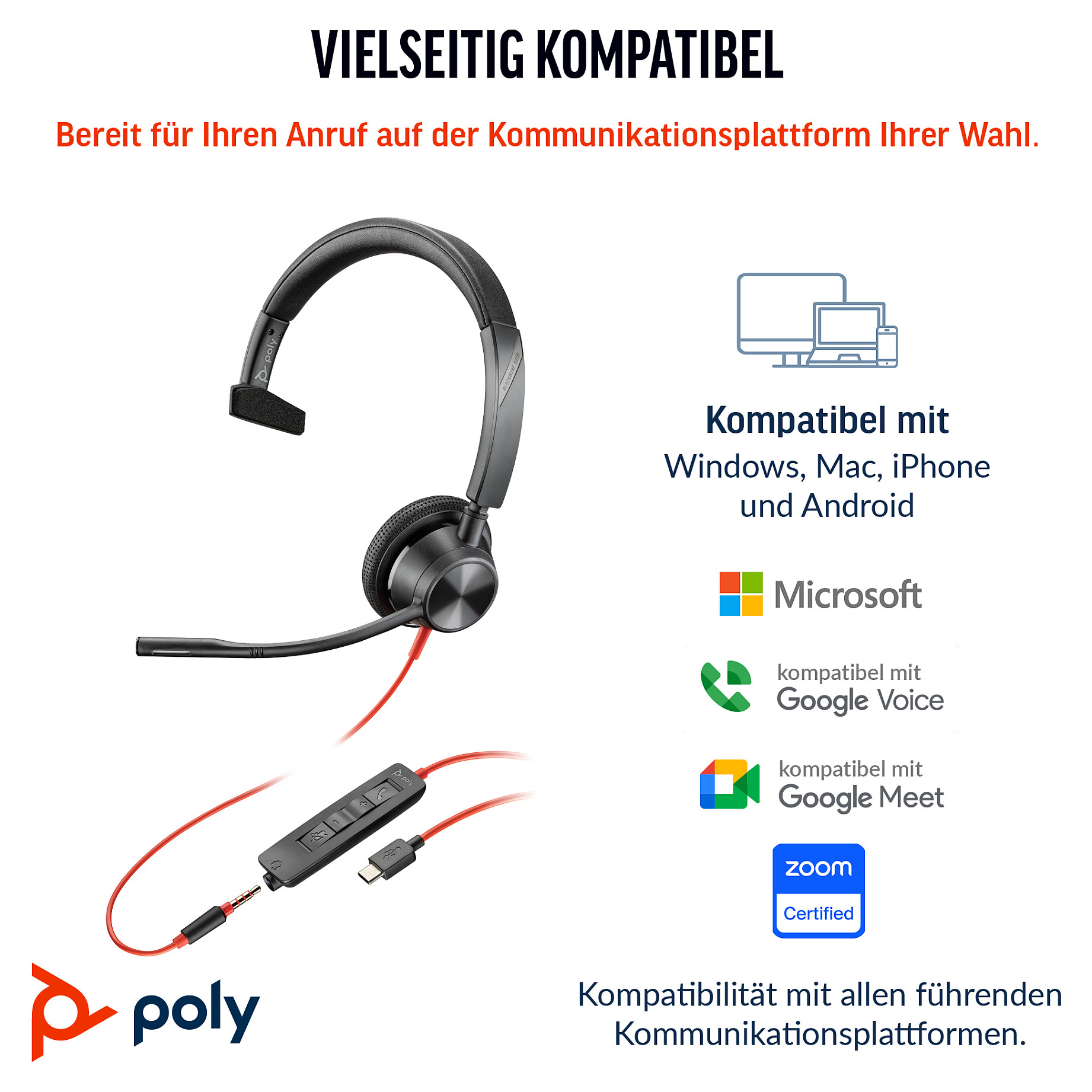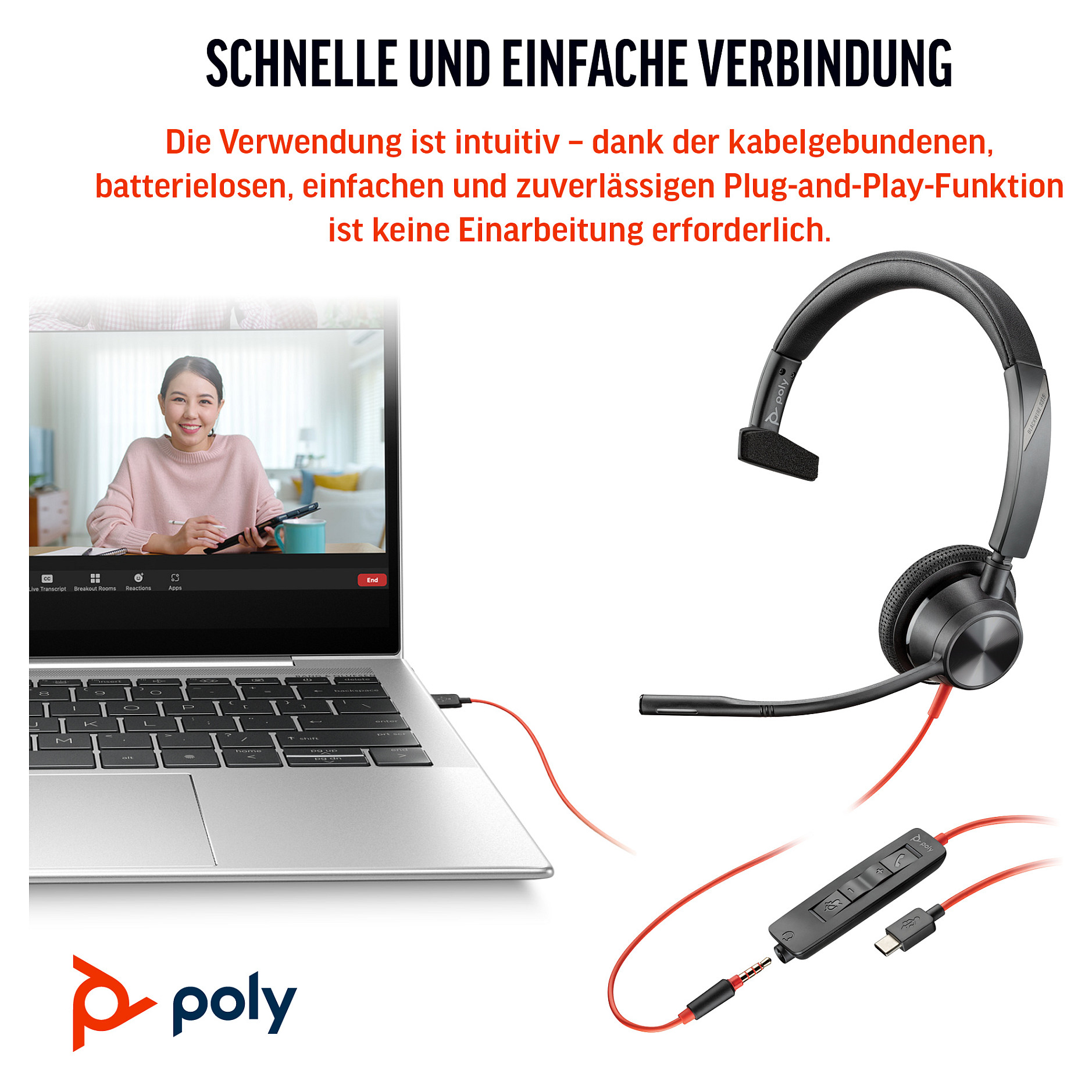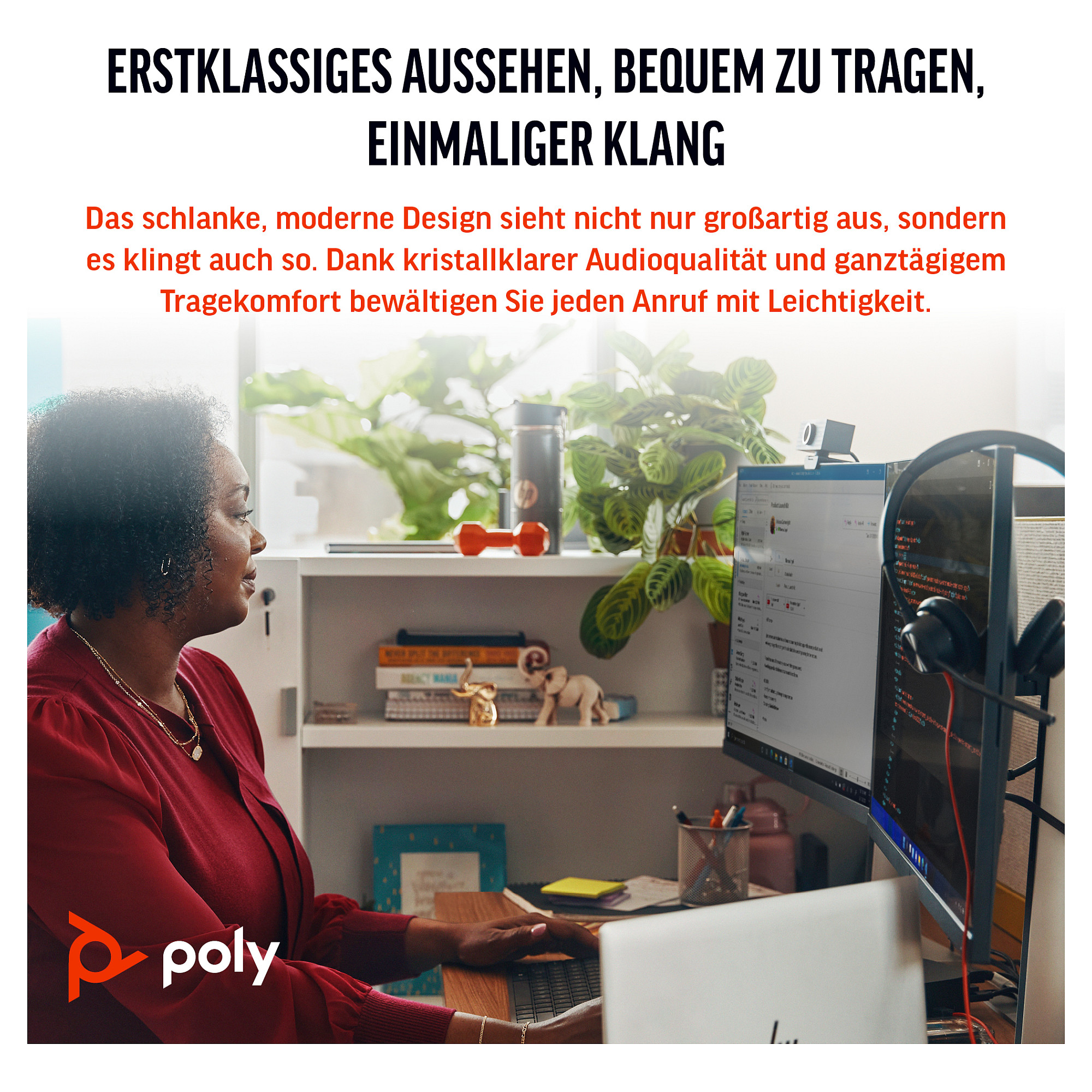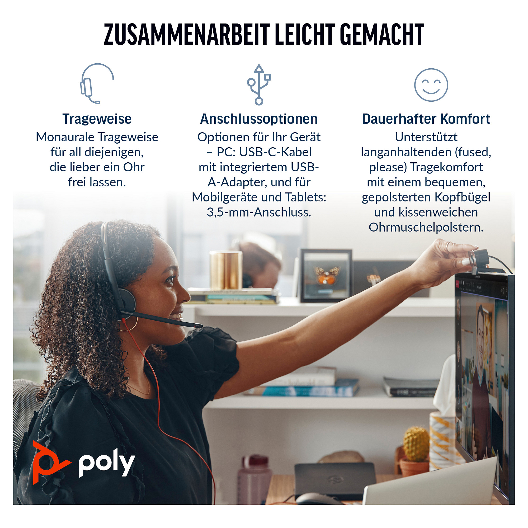 Komfort und Zuverlässigkeit stehen bei diesem schlichten und schicken Design im Vordergrund. Unverkennbare Audioqualität von Poly – damit Sie garantiert großartig klingen. Außerdem eingängige und einfache Funktionen, sodass jeder sein bevorzugtes Gerät einfach und unkompliziert verbinden kann.