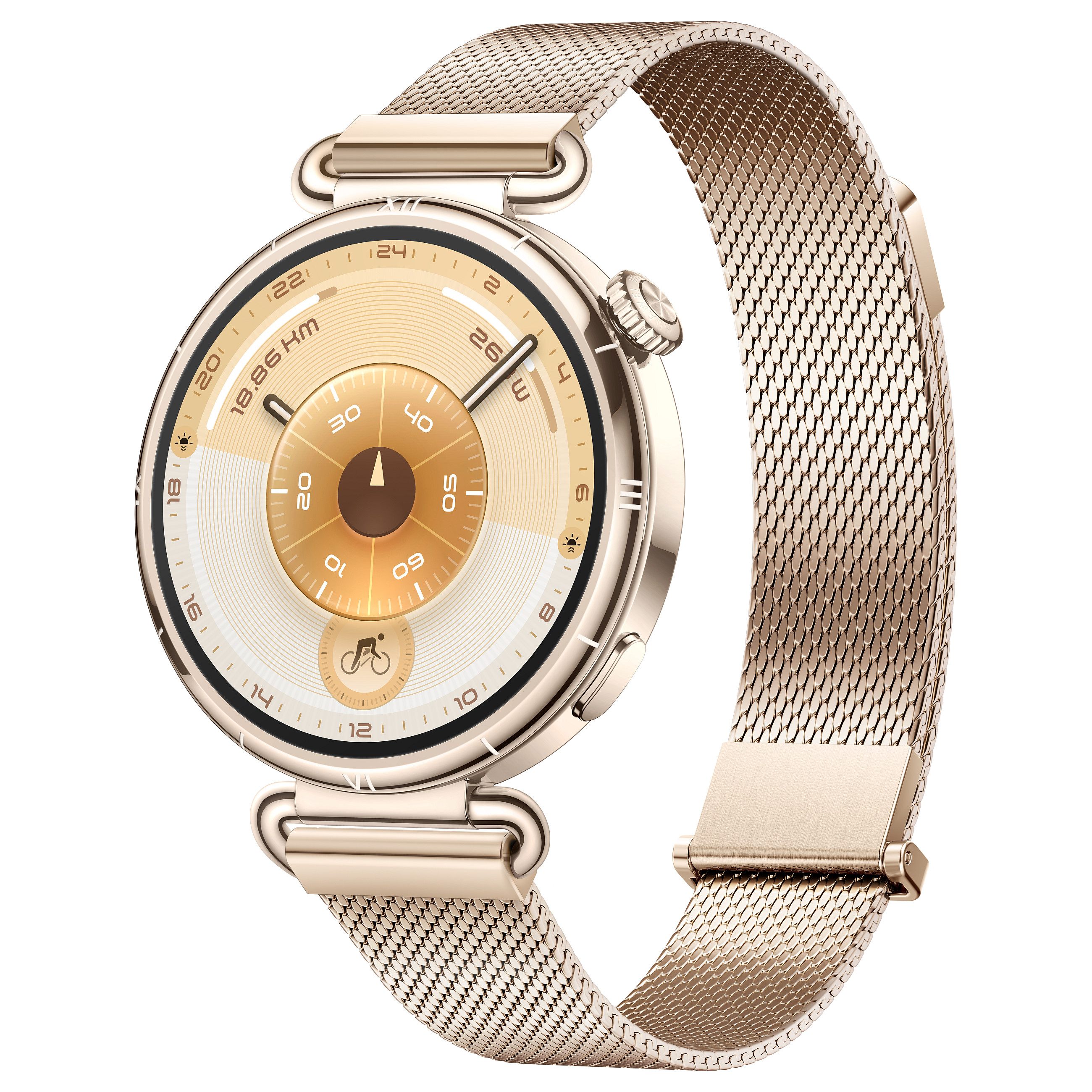 Huawei WATCH GT6. Bildschirmdiagonale: 3,35 cm (1.32"), Bildschirmtechnologie: AMOLED, Display-Auflösung: 466 x 466 Pixel, Touchscreen. Akku-/Batteriekapazität: 540 mAh. Gewicht: 38 g. Bandmaterial: Milanese, Armbandfarbe: Gold