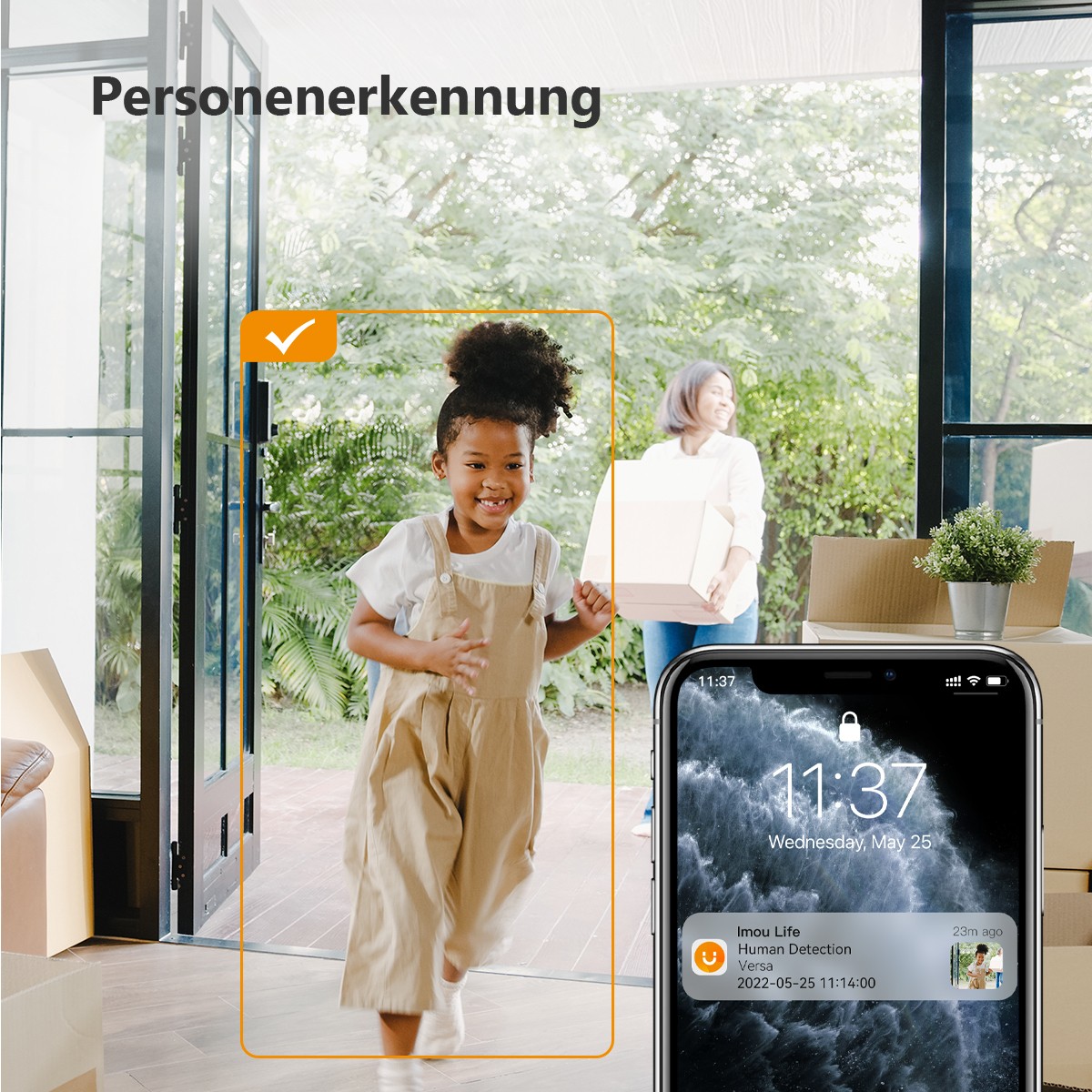 Die Versa-Überwachungskamera verfügt über eine auf künstlicher Intelligenz basierende Personenerkennung, die genaue Benachrichtigungen liefert und Fehlalarme verhindert. Darüber hinaus verfügt die Kamera über 4 Nachtsichtmodi, um optimale Sicherheit in den Abendstunden zu bieten. Sie haben zum Beispiel die Wahl zwischen Infrarot-Nachtsicht, die die Bilder klar und deutlich in Schwarz-Weiß zeigt, und Smart Color-Nachtsicht, die die Bilder mit Unterstützung des Scheinwerfers in Farbe zeigt. Alle Einstellungen und Anpassungen an der Kamera können in der praktischen Imou Life App-vorgenommen werden.