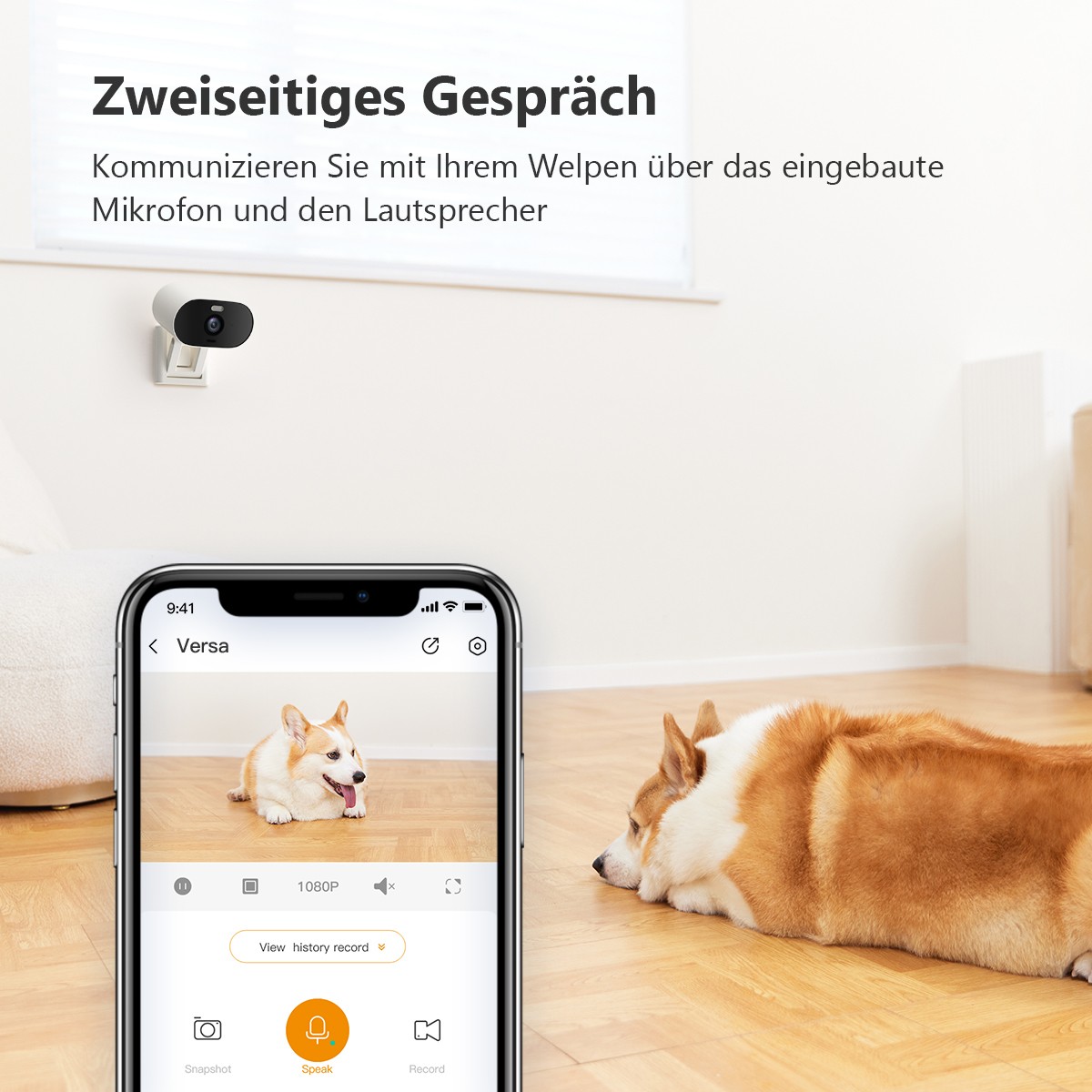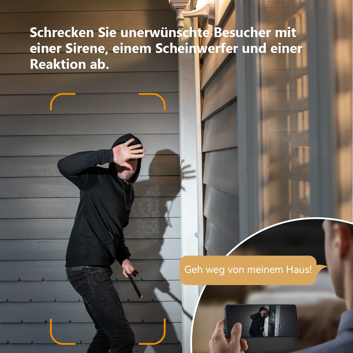 Die Gegensprechfunktion ermöglicht es Ihnen, zuzuhören und auf ein Ereignis zu reagieren. So haben Sie immer und überall die Kontrolle über das, was passiert, zum Beispiel an der Haustür oder im Wohnzimmer. Darüber hinaus kann die eingebaute Sirene manuell aktiviert werden, wenn durch eine erkannte Aktivität ein sofortiger Alarm ausgelöst wird.