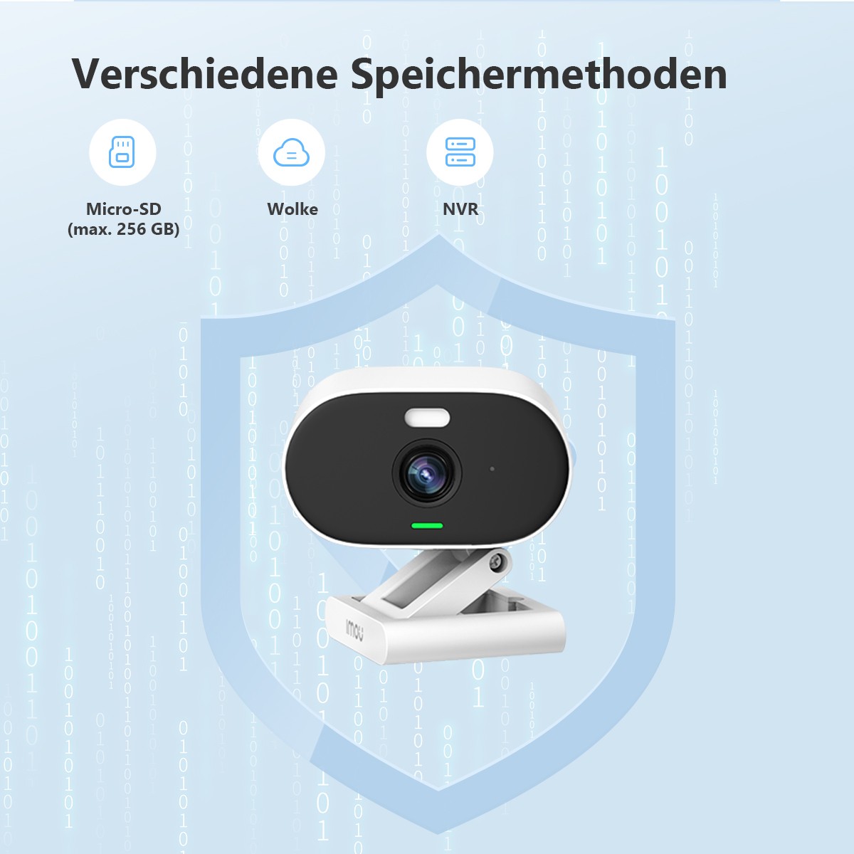 Laden Sie die Imou Life-App (iOS, Android oder Windows) herunter und richten Sie ein Imou-Konto ein. Nachdem Sie sich angemeldet haben, wählen Sie das ""+""-Zeichen oben rechts in der Imou-App, um eine Kamera hinzuzufügen. Scannen Sie den QR-Code auf der Kamera und folgen Sie den Schritten in der App. Wählen Sie dann das WLAN-Netzwerk (2,4 GHz) und stellen Sie sicher, dass sich die Kamera während des Installationsvorgangs in der Nähe des Routers befindet. Die Kamera ist im Handumdrehen einsatzbereit. Für die Aufzeichnung von Bildern können Sie den Imou Cloud-Service wählen sowie eine Micro SD-Karte oder einen Imou NVR für die lokale Speicherung verwenden.