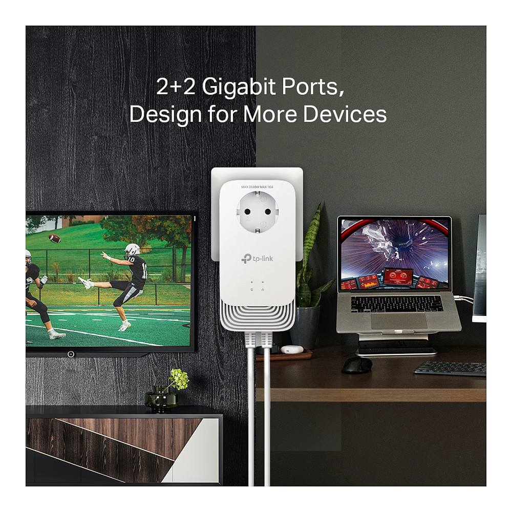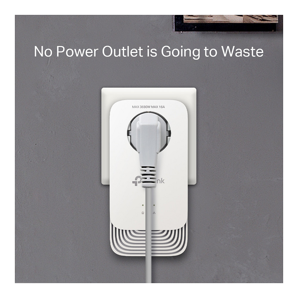 Durch die integrierte Steckdose können Sie Ihre anderen Geräte weiterhin mit Strom aus der Steckdose versorgen. Stecken Sie Ihr Gerät einfach wie eine normale Steckdose in die integrierte Steckdose. Der eingebaute Rauschfilter trägt auch dazu bei, elektrisches Signalrauschen zu eliminieren, das andernfalls die Powerline-Übertragungsleistung beeinträchtigen könnte.