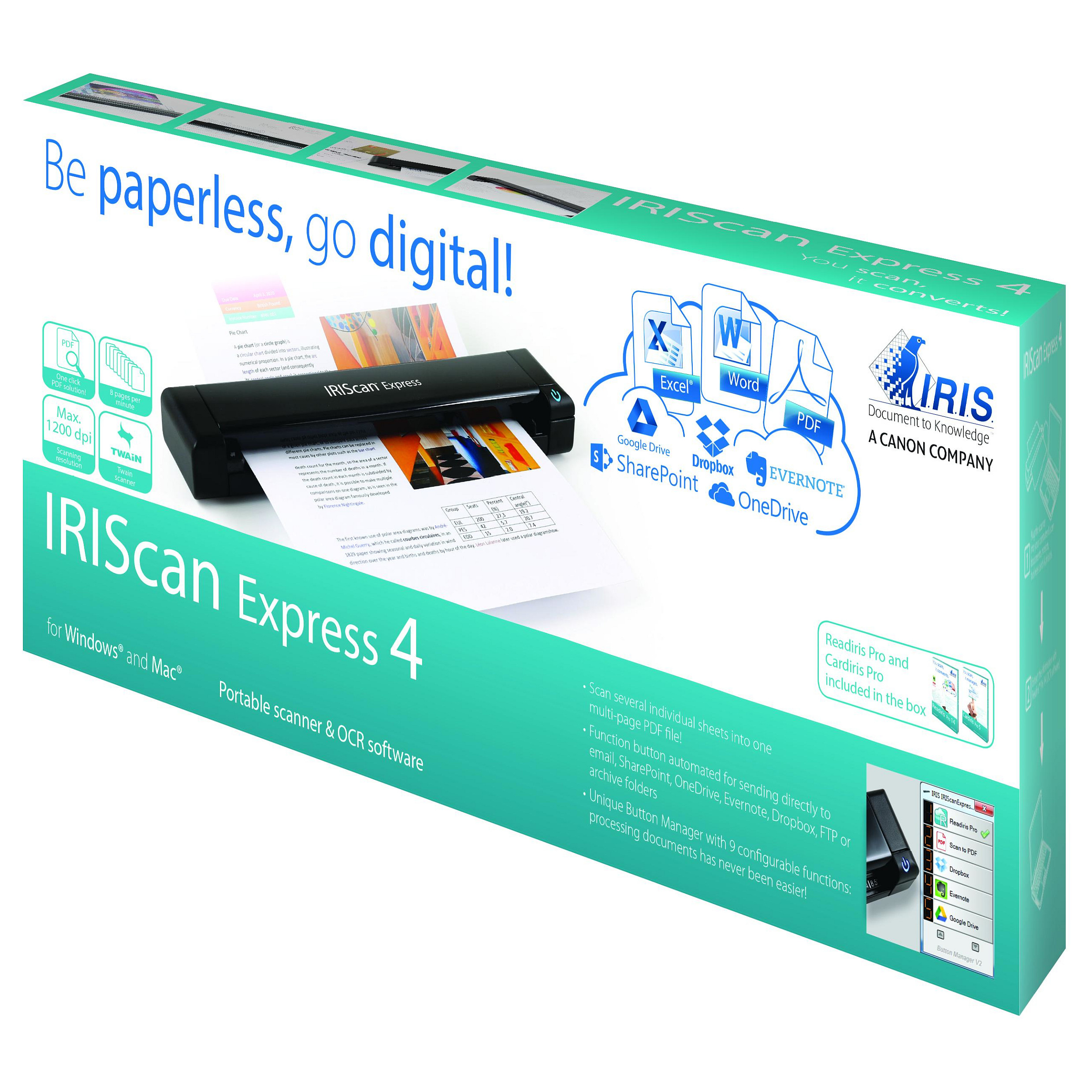 Der IRIScanTM Express 4 ist die leistungsstarke Kombination eines vollständig mobilen Farbscanners mit bahnbrechender und benutzerfreundlicher OCR- Software. Er vereinfacht Ihre Erfassungsanforderungen, egal ob Sie zuhause, unterwegs, in Bibliotheken usw. sind. Kompakt, leicht und mit Stromversor- gung über USB ist er der schnellste mobile Scanner mit Einzelblatteinzug auf dem Markt, der überall mitgenommen werden kann und in jede Handtasche, jeden Rücksack oder jede Laptoptasche passt.