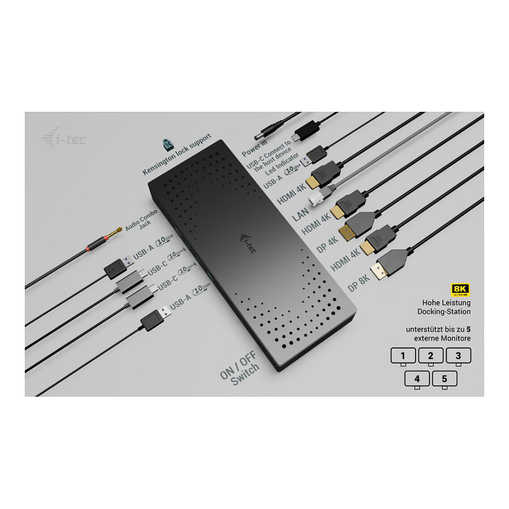 Die leistungsstärkste Dockingstation, die es gibt! Unterstützt bis zu fünf externe Monitore* mit einer Auflösung von 4K/60 Hz. Und ein Monitor kann sogar mit 8K/60 Hz betrieben werden! Das ideale Dock-Produkt für Benutzer, die mehrere Monitore benötigen, ohne Kompromisse bei Bildstabilität, Auflösung und Bildwiederholrate eingehen zu müssen. Die Dockingstation verfügt außerdem über zwei USB-C-Schnellladeanschlüsse (mit einer Ladeleistung von bis zu 15 W), insbesondere zum Laden von Smartphones und Tablets, sowie über schnelle USB-Anschlüsse, einen 2,5-Gbit/s-LAN-Anschluss und andere Peripheriegeräte.