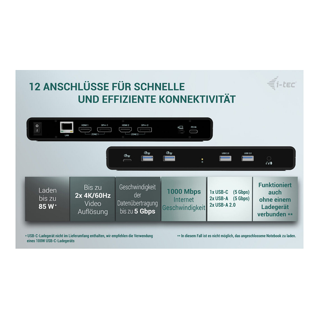 Viele Anschlüsse, eine zuverlässige und schnelle Verbindung zum Unternehmensnetzwerk dank des integrierten LAN-Ports und die Unterstützung für die Installation hinter einem Monitor machen diese Dockingstation zum idealen Begleiter für echte Profis. Die Dockingstation kann sowohl in Verbindung mit einem Laptop (ohne USB-C-Ladegerät) als auch mit einem USB-C-Ladegerät (nicht im Lieferumfang enthalten) verwendet werden. In diesem Fall unterstützt sie das Aufladen eines Laptops oder Tablets mit einer Leistung von bis zu 85 W.