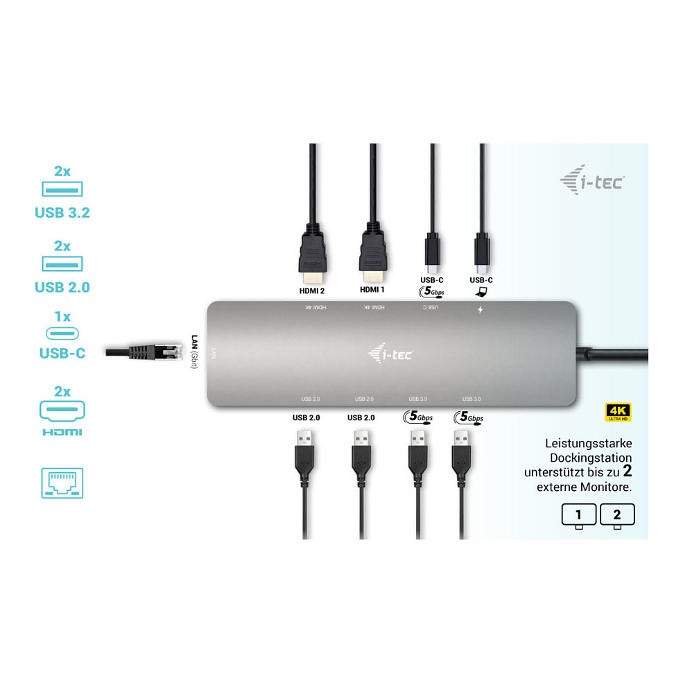 Kleine USB-C-Dockingstation aus Metall, die bis zu zwei externe Monitore gleichzeitig unterstützen kann*. Schließen Sie einfach Ihren Laptop oder Ihr Tablet an (Treiber müssen nicht installiert werden) und profitieren Sie von der schnellen USB-Datenübertragung und der Internetverbindung über einen LAN-Anschluss. Und natürlich kann die Dockingstation Ihren Laptop auch mit bis zu 100 W mit Strom versorgen, sodass Sie alle Laptops und Tablets aufladen können, die das Aufladen über USB-C (USB-C Power Delivery) unterstützen.