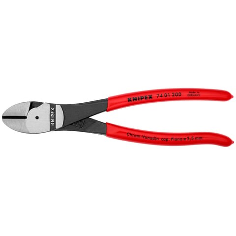 Knipex 74 01 200 SB. Produkttyp: Hand-Kabelschneider, Handgrifffarbe: Rot, Produktfarbe: Schwarz, Edelstahl. Länge (mm): 200 mm, Breite: 84 mm, Gewicht: 285 g