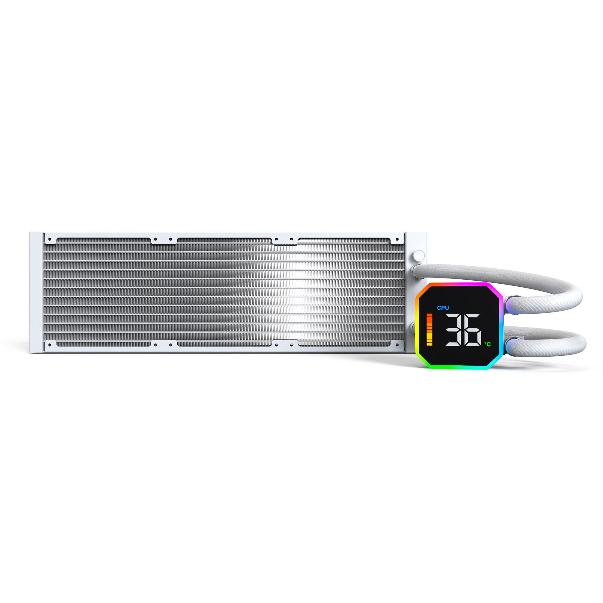 Montech HyperFlow Digital 360. Typ: All-in-One-Flüssigkeitskühler, Lüfterdurchmesser: 12 cm, Luftstrom: 129,5 m³/h, Maximum Luftdruck: 96,27 mmH2O, Lagertyp: Fluiddynamisches Lager (FDB). Produktfarbe: Weiß