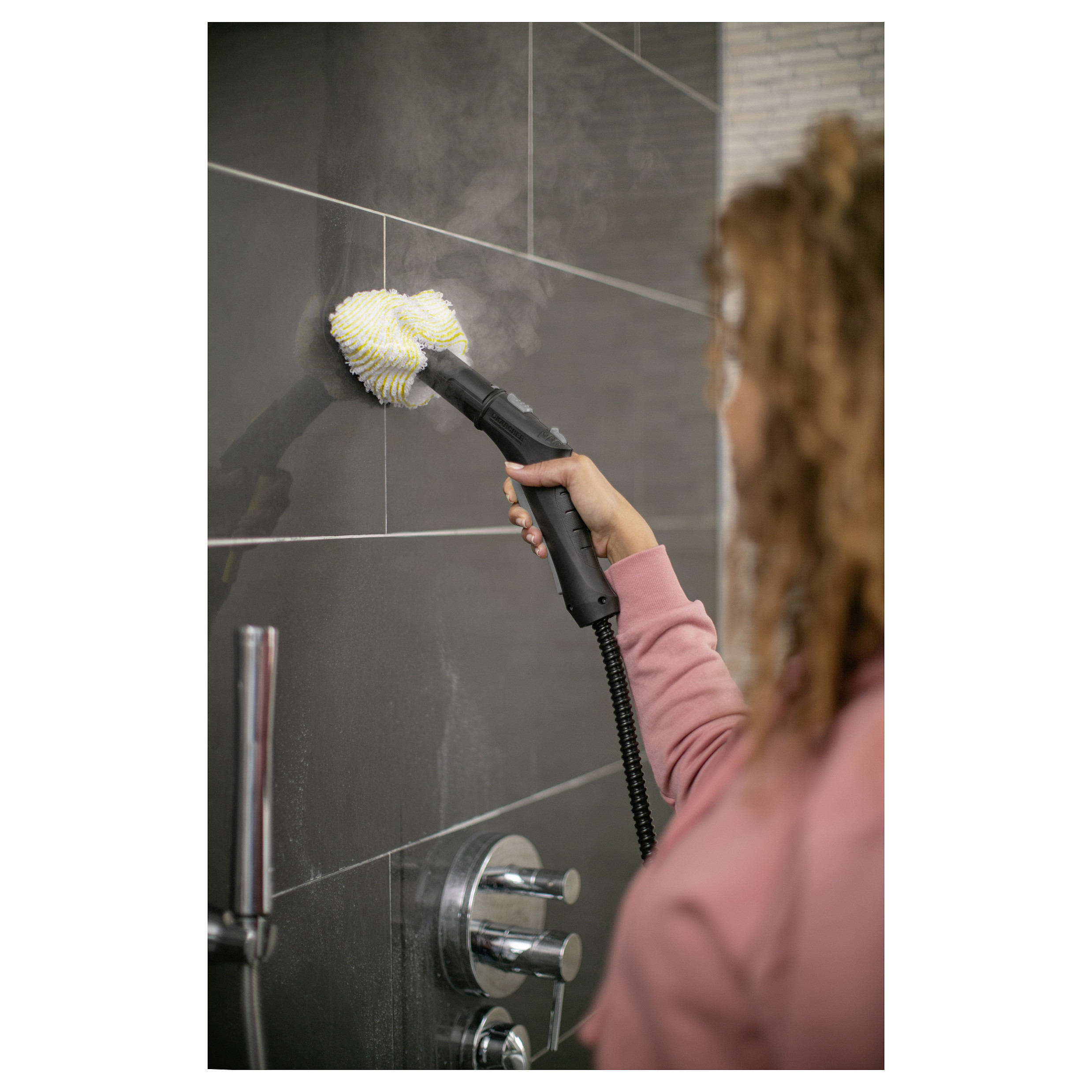 Der kompakte und leichte Einstiegs-Dampfreiniger SC 2 Deluxe bietet eine 2-stufige Dampfregulierung zur Anpassung der Dampfintensität an Oberfläche und Verschmutzungsgrad. Bei gründlicher Reinigung mit dem Kärcher Dampfreiniger werden bis zu 99,999 % der Viren* und 99,99 % aller haushaltsüblichen Bakterien** auf haushaltsüblichen Hartflächen beseitigt – und das völlig ohne Chemie. Über den innovativen LED-Leuchtring zeigt der SC 2 Deluxe jederzeit den Betriebsmodus an. Die Zubehöre können im Zubehörbeutel verstaut werden. Die Bodendüse EasyFix mit flexiblem Gelenk garantiert höchste Ergonomie und sorgt dank der Lamellentechnologie für perfekte Reinigungsergebnisse. Durch das komfortable Klettsystem lässt sich das Bodentuch einfach und schnell an der Bodendüse fixieren und ohne Schmutzkontakt entfernen. Mithilfe des vielfältigen Zubehörs werden Fliesen, Kochfelder, Dunstabzugshaube und sogar kleinste Ritzen hygienisch sauber. Selbst hartnäckige Verschmutzungen lassen sich zuverlässig beseitigen.