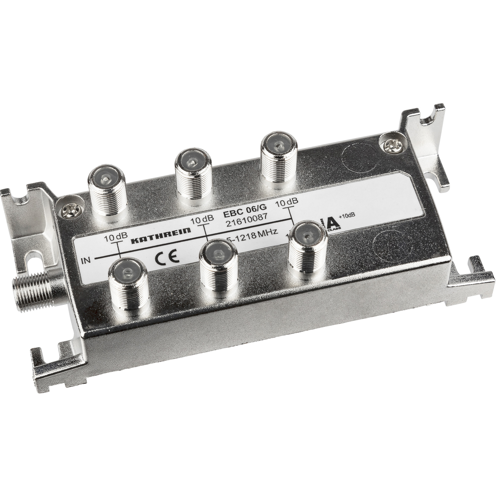 6fach-Verteiler, 10 dB, 5-1218 MHz, F-Connector, Trennkondensatoren an Ein- und Ausgängen, Schirmungsklasse A gem. CENELEC EN 50083-2