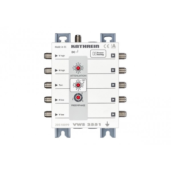 Kathrein VWS 2551. Anzahl der Eingänge: 1 Eingänge, Anzahl der Ausgänge: 4 Ausgänge, Satellite Channel Router (SatCR) Frequenzbereich: 950 - 2150 MHz. Eingangsspannung: 18 V, Eingangsspannungsbereich: 108 - 112 dBμV, Ausgangsspannung: 104 dBμV. Breite: 112 mm, Tiefe: 43 mm, Höhe: 148 mm