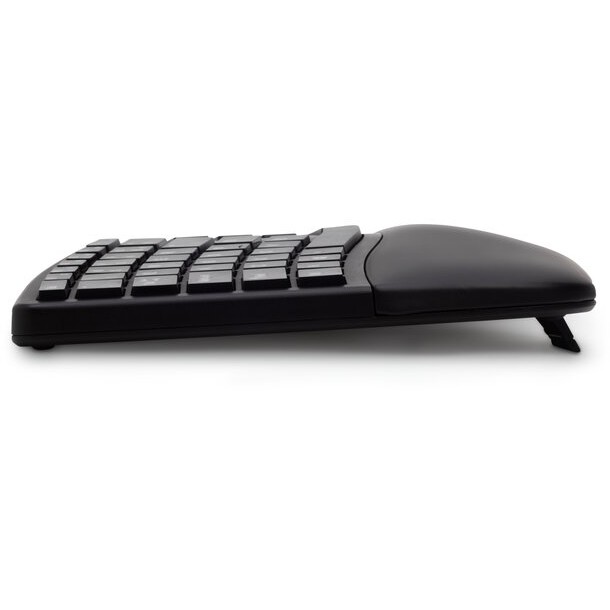 Die geteilte und schräg abfallende Tastatur mit verstellbarer entgegengesetzter Neigung bringt Hände, Handgelenke und Unterarme in eine bequeme Arbeitshaltung, die neutral ausgerichtet werden kann.