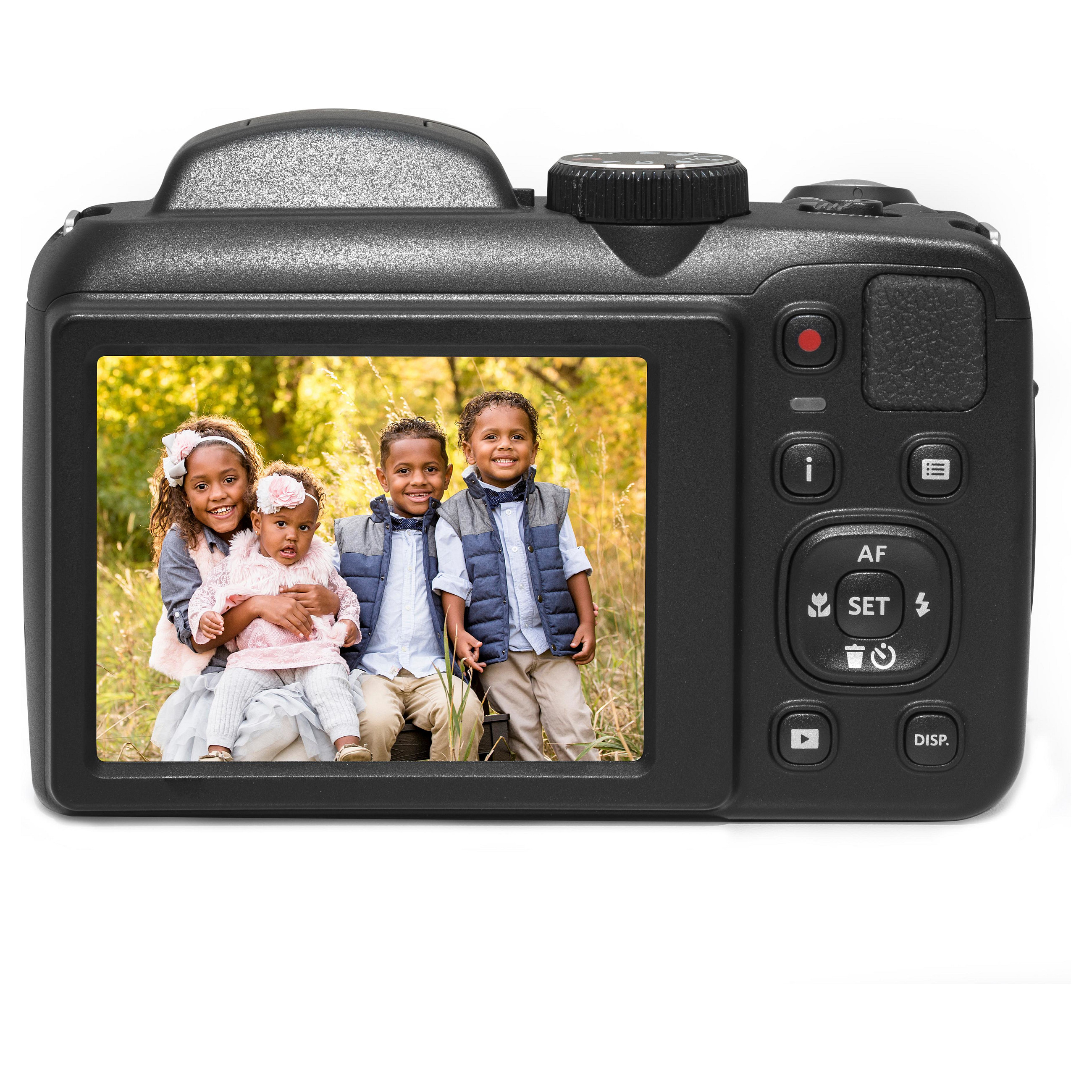 Kodak ASTRO ZOOM. Kamera-Typ: Kompaktkamera, Megapixel (ca.): 16,35 MP, Größe des Bildsensors: 1/2.3", Sensor-Typ: BSI CMOS. ISO-Empfindlichkeit (max): 3200. Optischer Zoom: 25x, Digitaler Zoom: 4x, Brennweitenbereich: 4.3 - 107.5 mm. Kürzeste Verschlusszeit: 1/2000 s. HD-Typ: Full HD, Maximale Video-Auflösung: 1920 x 1080 Pixel. Bildschirmdiagonale: 7,62 cm (3"). Speicherkapazität: 67 MB. Gewicht: 336 g. Produktfarbe: Schwarz