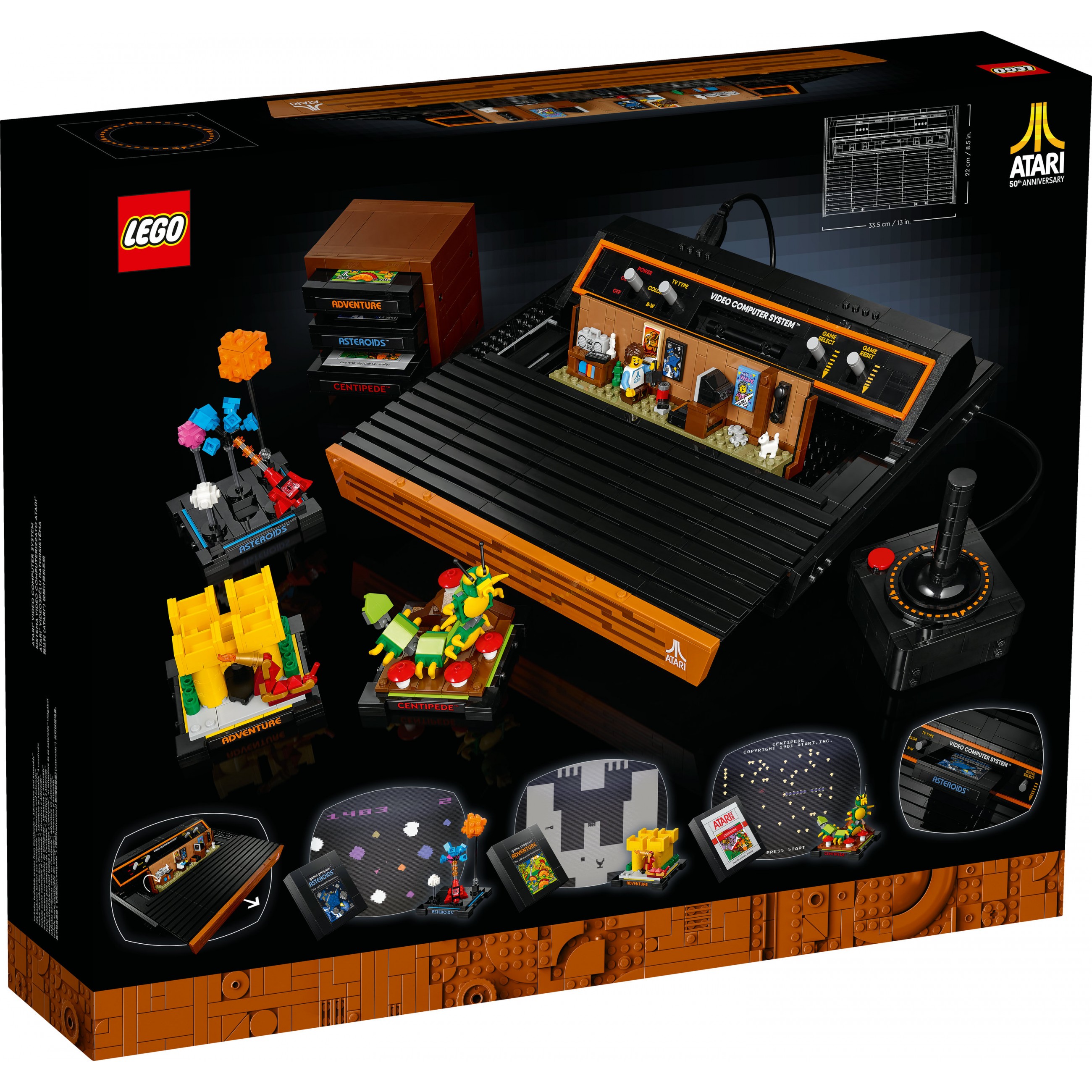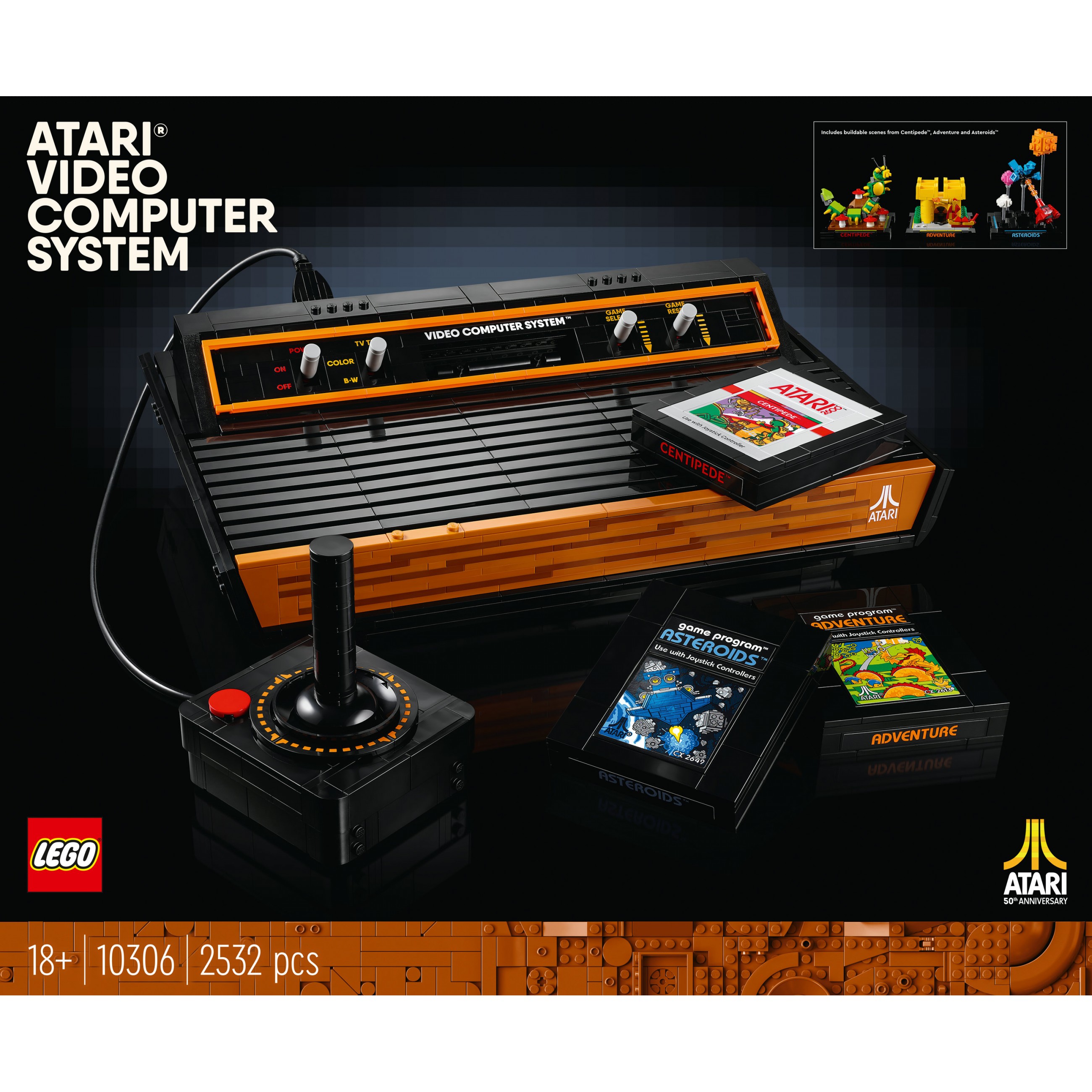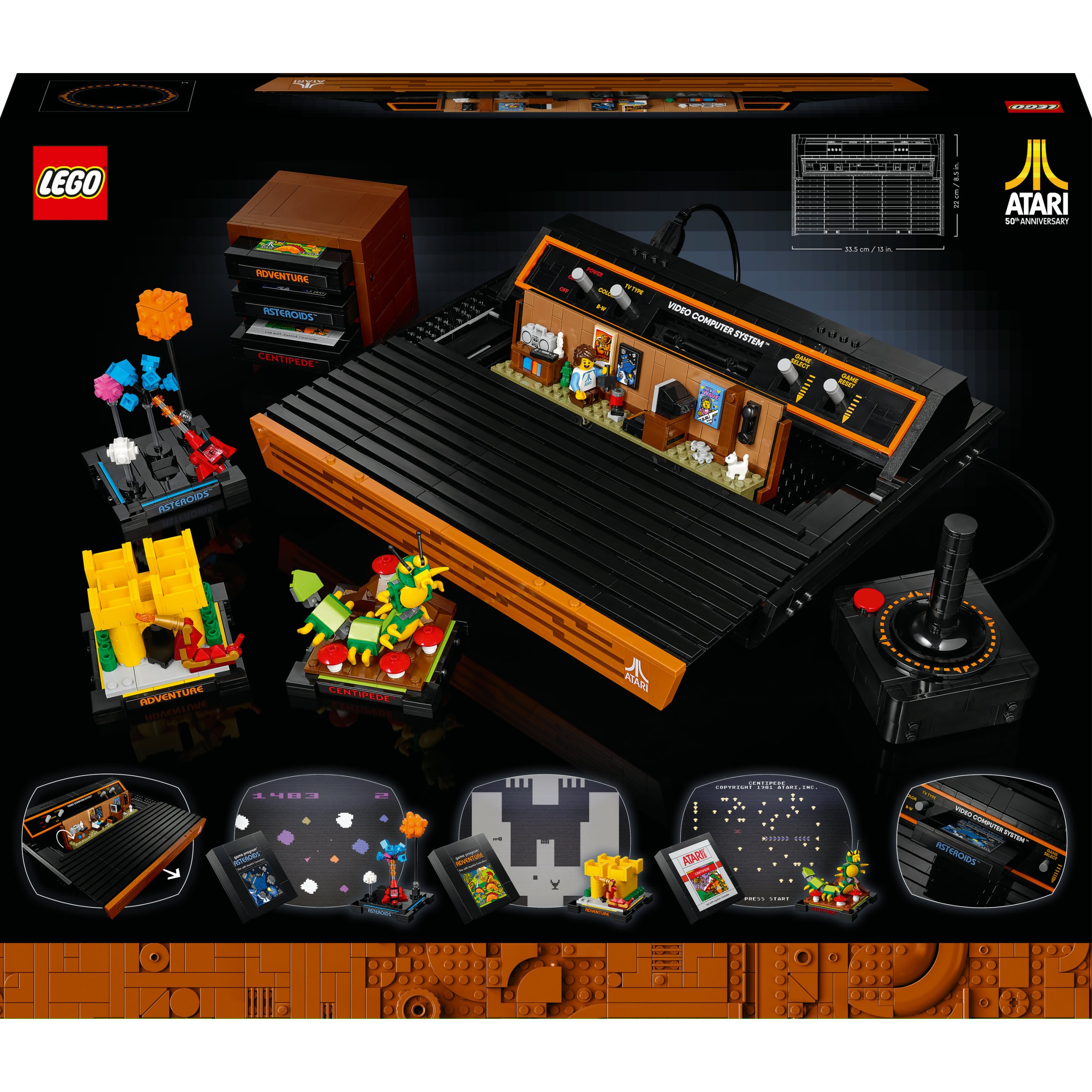 Entdecke 3 der beliebtesten Atari® Spiele wieder: Asteroids™, Adventure und Centipede™. Zu jedem dieser Spiele ist ein Replika-Steckmodul vorhanden und du kannst 3 Szenen bauen, die die Handlung des jeweiligen Spiels darstellen. Die Module kann man in den Schacht der Konsole stecken oder im Halter aufbewahren. Den Grafiken im typischen LEGO Stil dienten Atari® Originaldesigns als Vorbild.