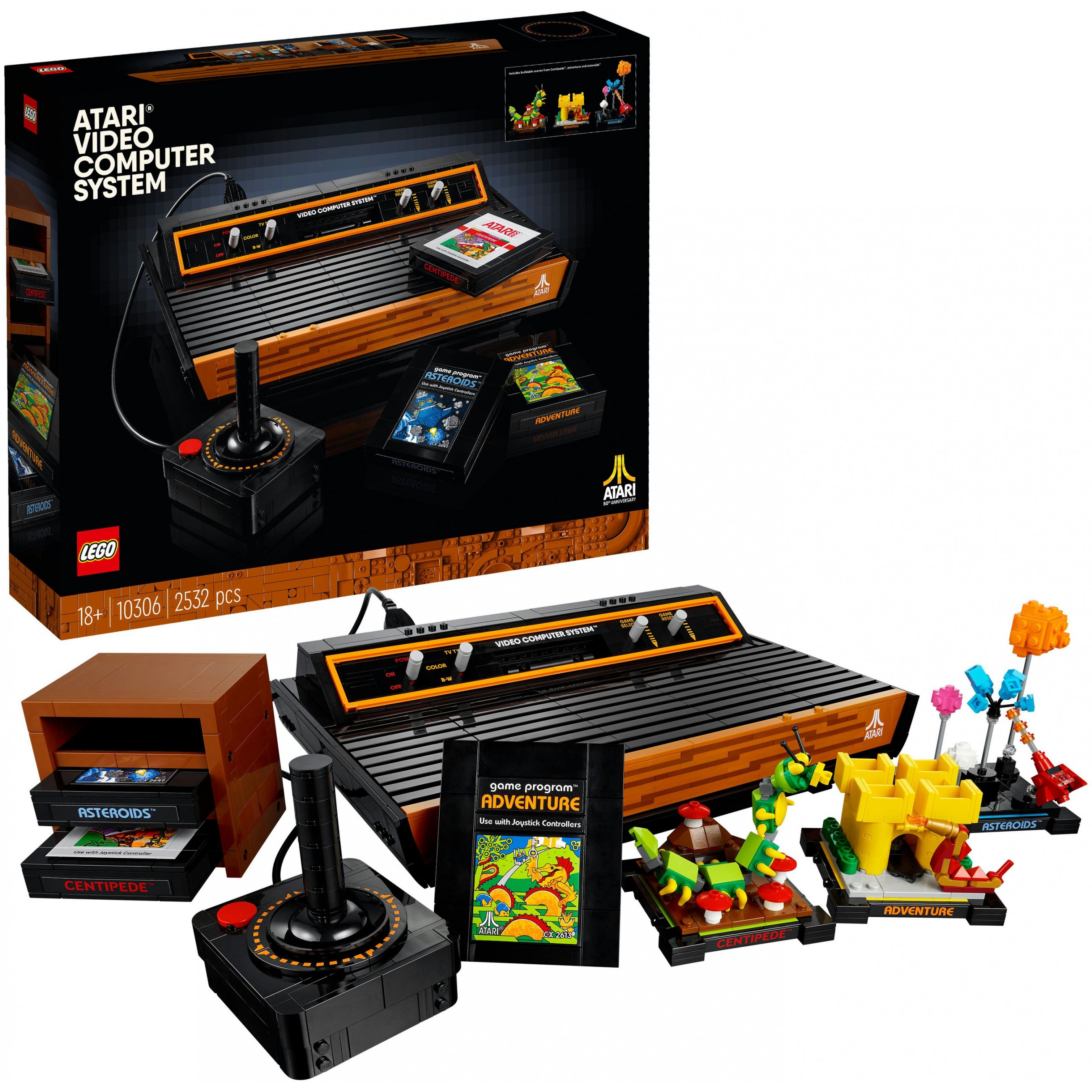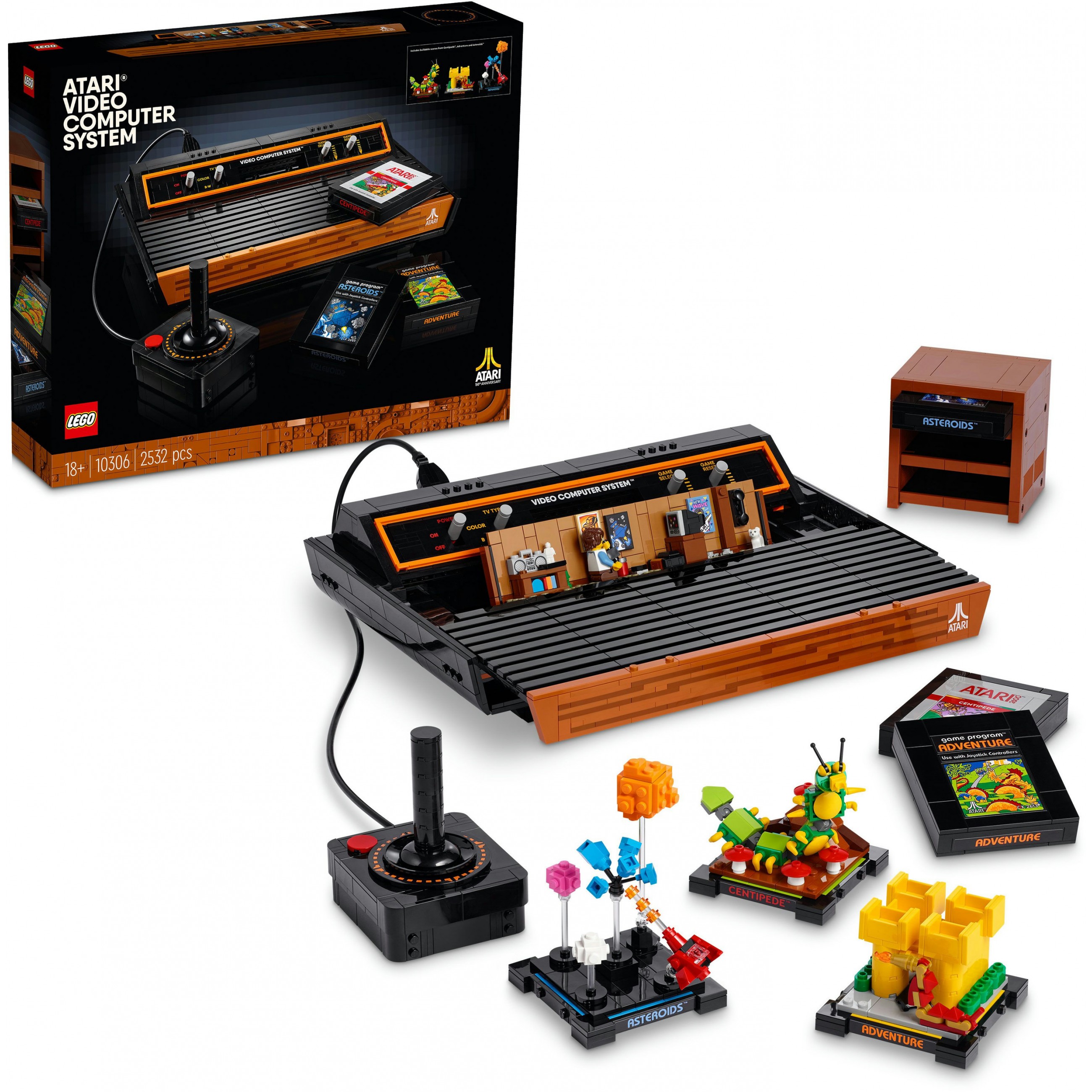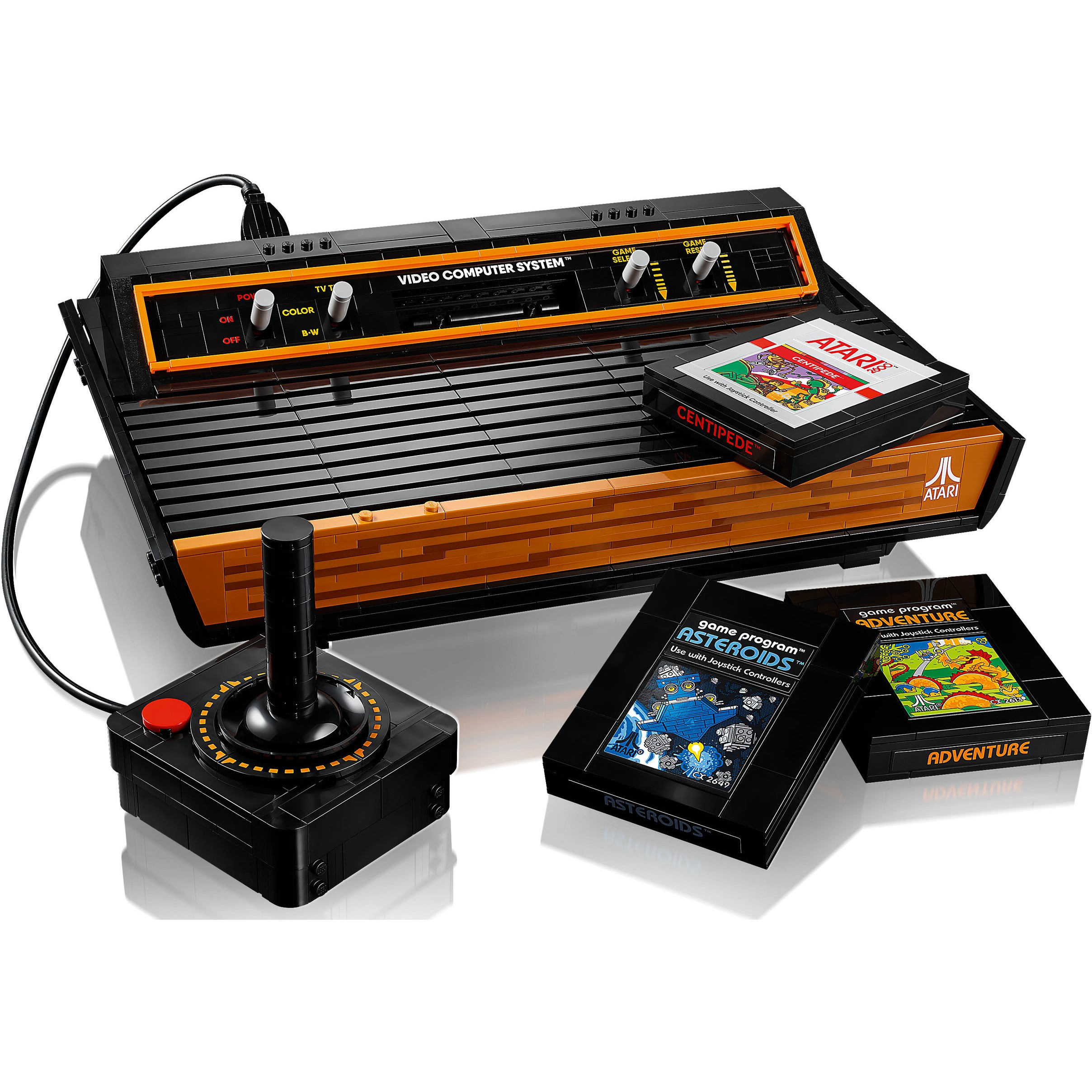 Entdecke 3 der beliebtesten Atari® Spiele wieder: Asteroids™, Adventure und Centipede™. Zu jedem dieser Spiele ist ein Replika-Steckmodul vorhanden und du kannst 3 Szenen bauen, die die Handlung des jeweiligen Spiels darstellen. Die Module kann man in den Schacht der Konsole stecken oder im Halter aufbewahren. Den Grafiken im typischen LEGO Stil dienten Atari® Originaldesigns als Vorbild.