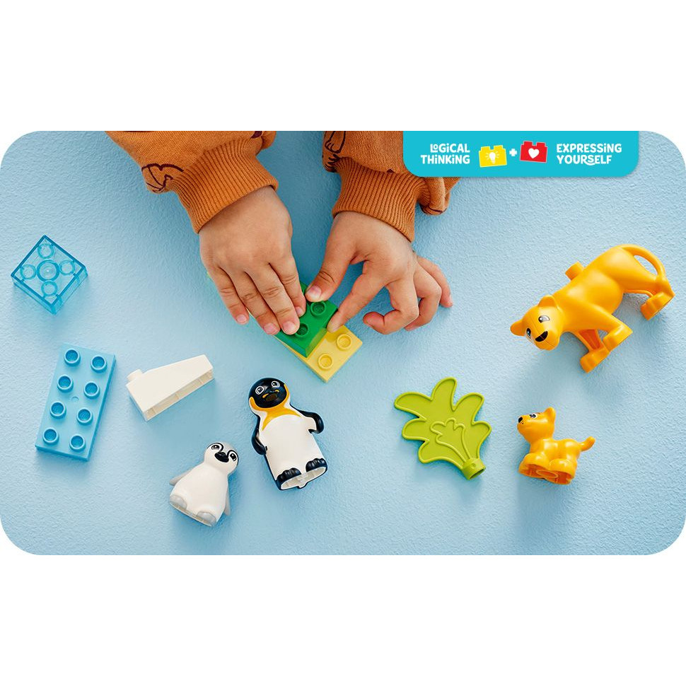 Spielzeugpinguine und -löwen für Kinder: Dieses Spielset beinhaltet 2 Lebensräume aus LEGO® Steinen und 4 LEGO DUPLO® Tierfiguren – einen erwachsenen Pinguin mit Küken und eine Löwin mit ihrem Jungen – für viele lustige Rollenspiele