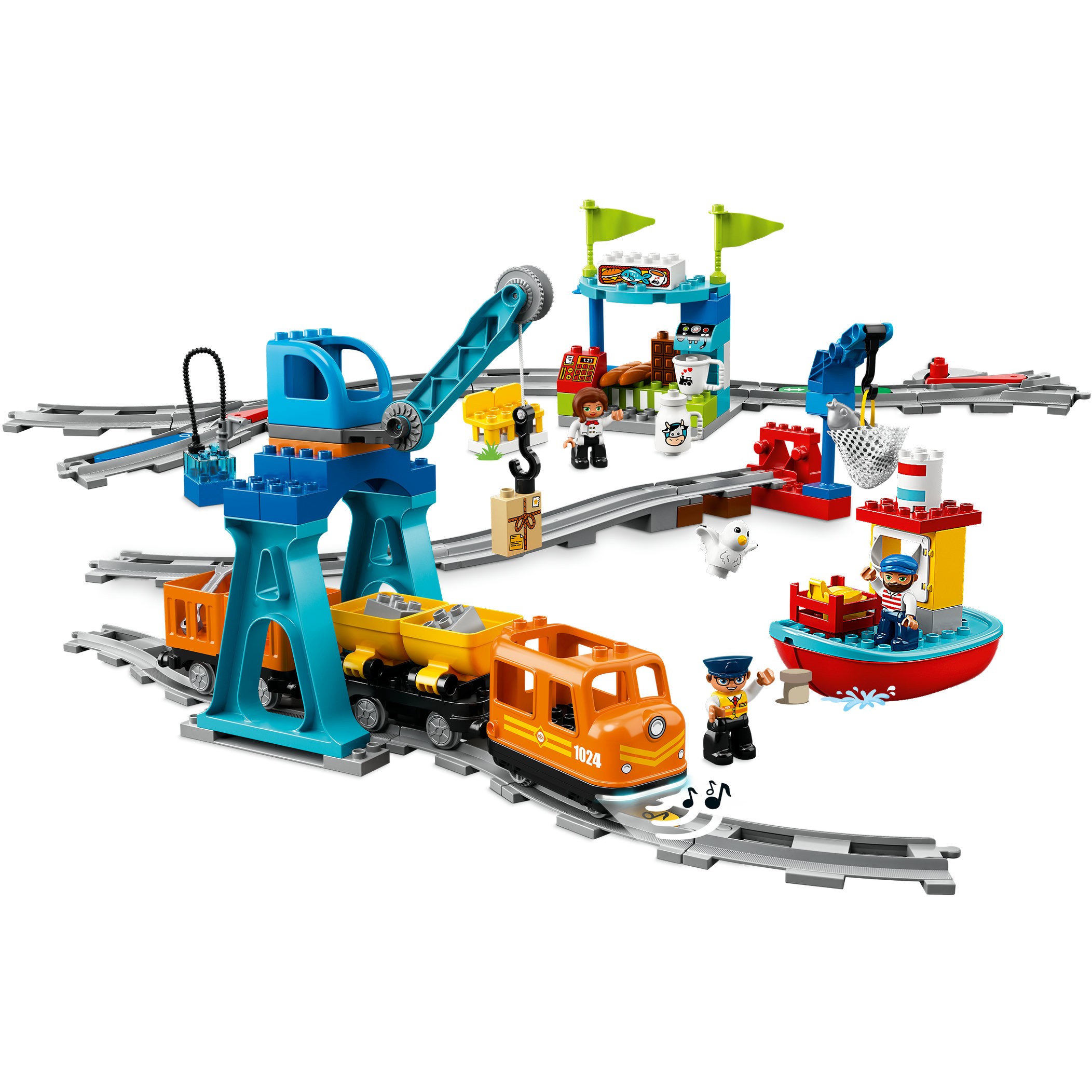 Das Set enthält eine „Push & Go“-Lok mit Lichtern und Geräuschen, 2 Güterwaggons mit Kippfunktion, 5 farbcodierte Funktionssteine, einen Hafenbereich mit kleinem Kran und Boot, einen großen Kran, ein Café, einen Ver- und Entladebahnhof sowie 24 Eisenbahnelemente, unter anderem Weichen, Steigungen, eine Kreuzung und Prellböcke.
