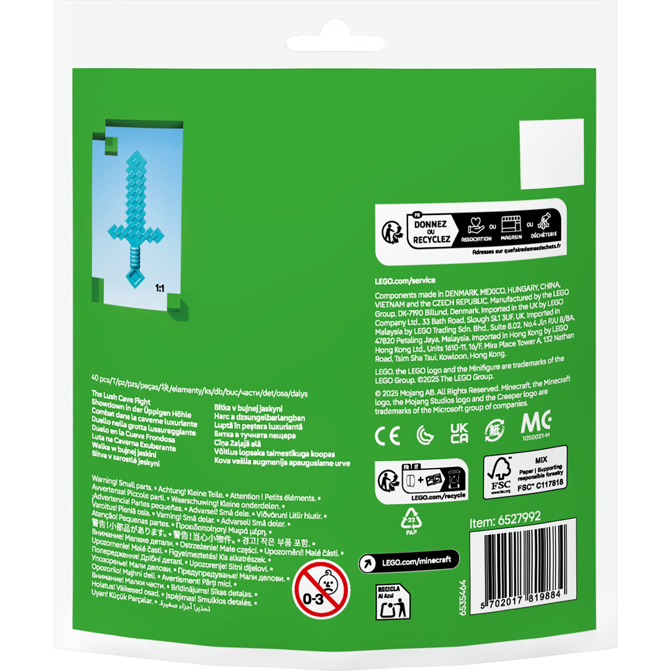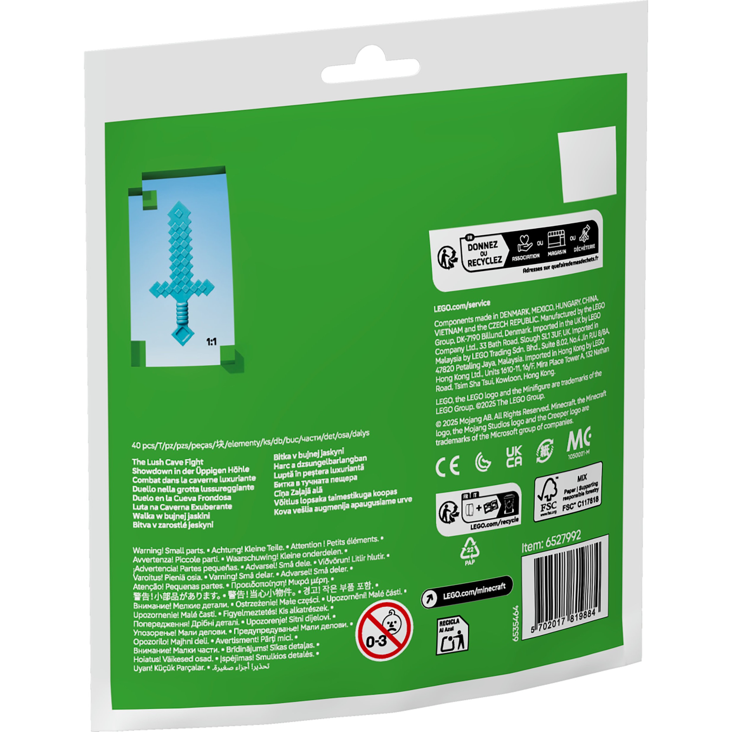 Alex benutzt ihr Diamantschwert, um ein Skelett mit einem Bogen aus einer üppigen Höhle zu verscheuchen, in der es Ton, Moos, Blumen, Ranken, Glühbeeren und Tropfblätter gibt.