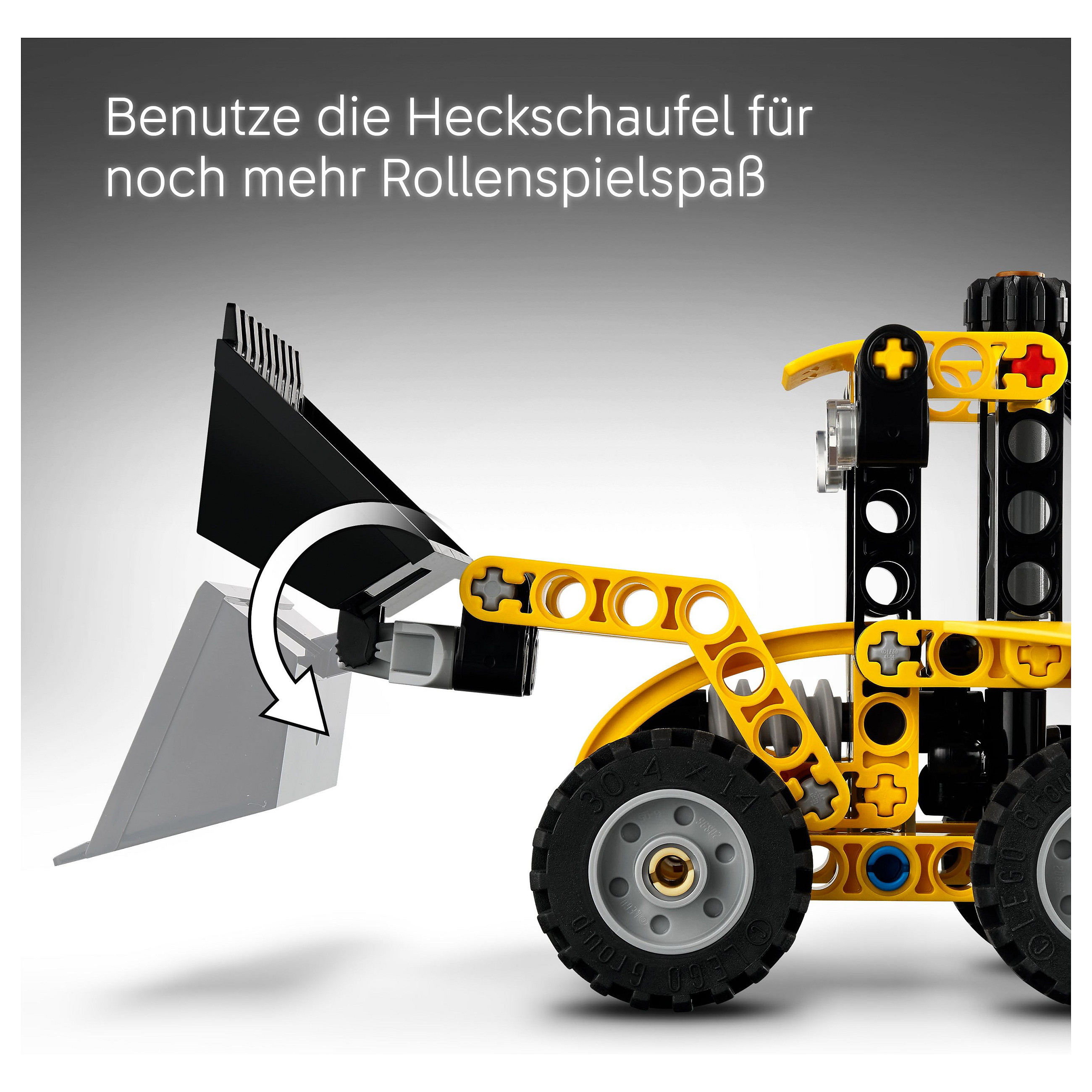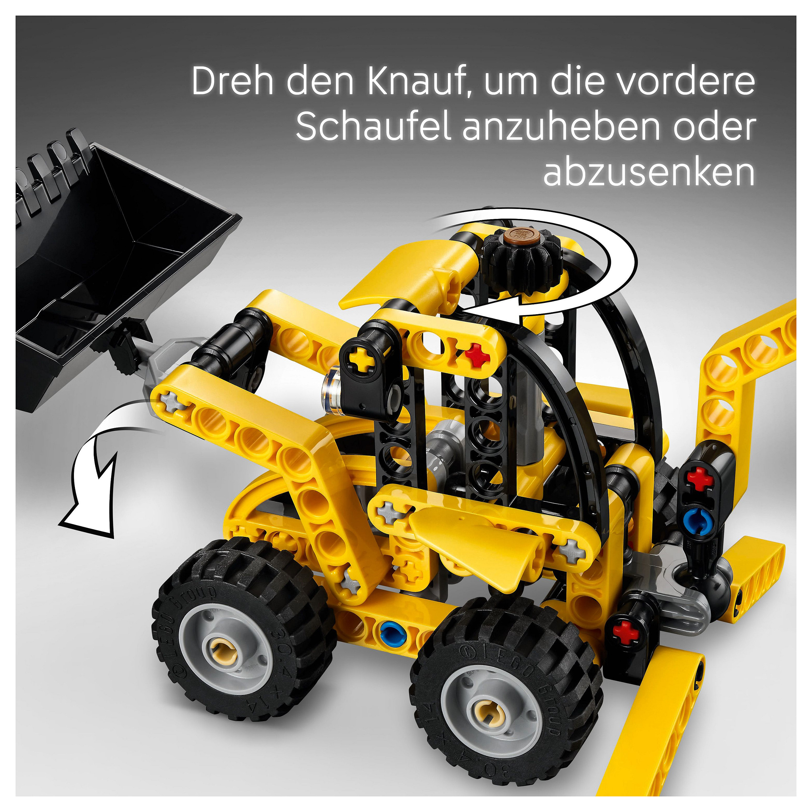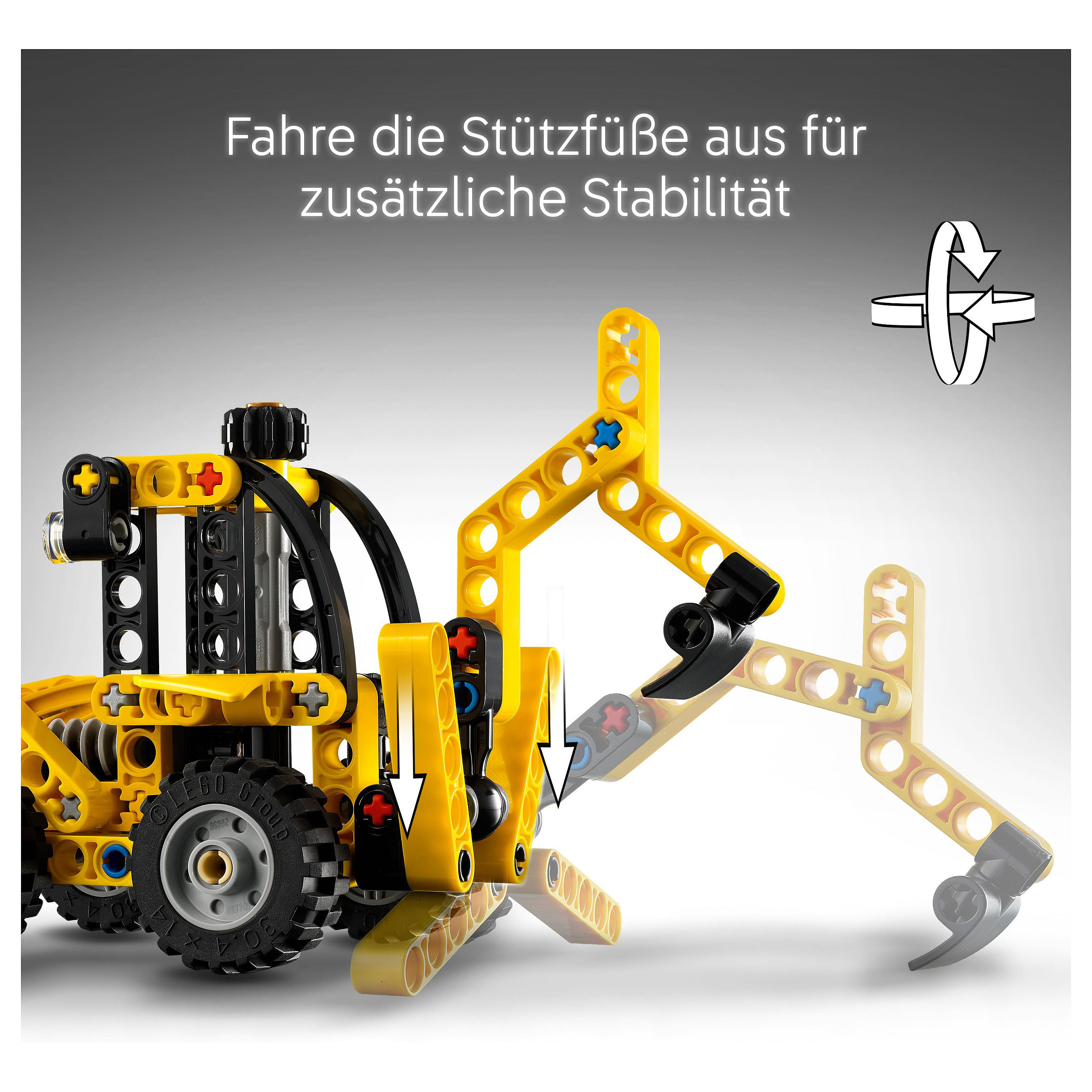 Probiere die vordere und hintere Schaufel aus: Der LEGO® Technic Baggerlader verfügt neben einer Heckschaufel und Stützfüßen auch über eine vordere Schaufel, die man mithilfe des Knaufs anheben oder absenken kann