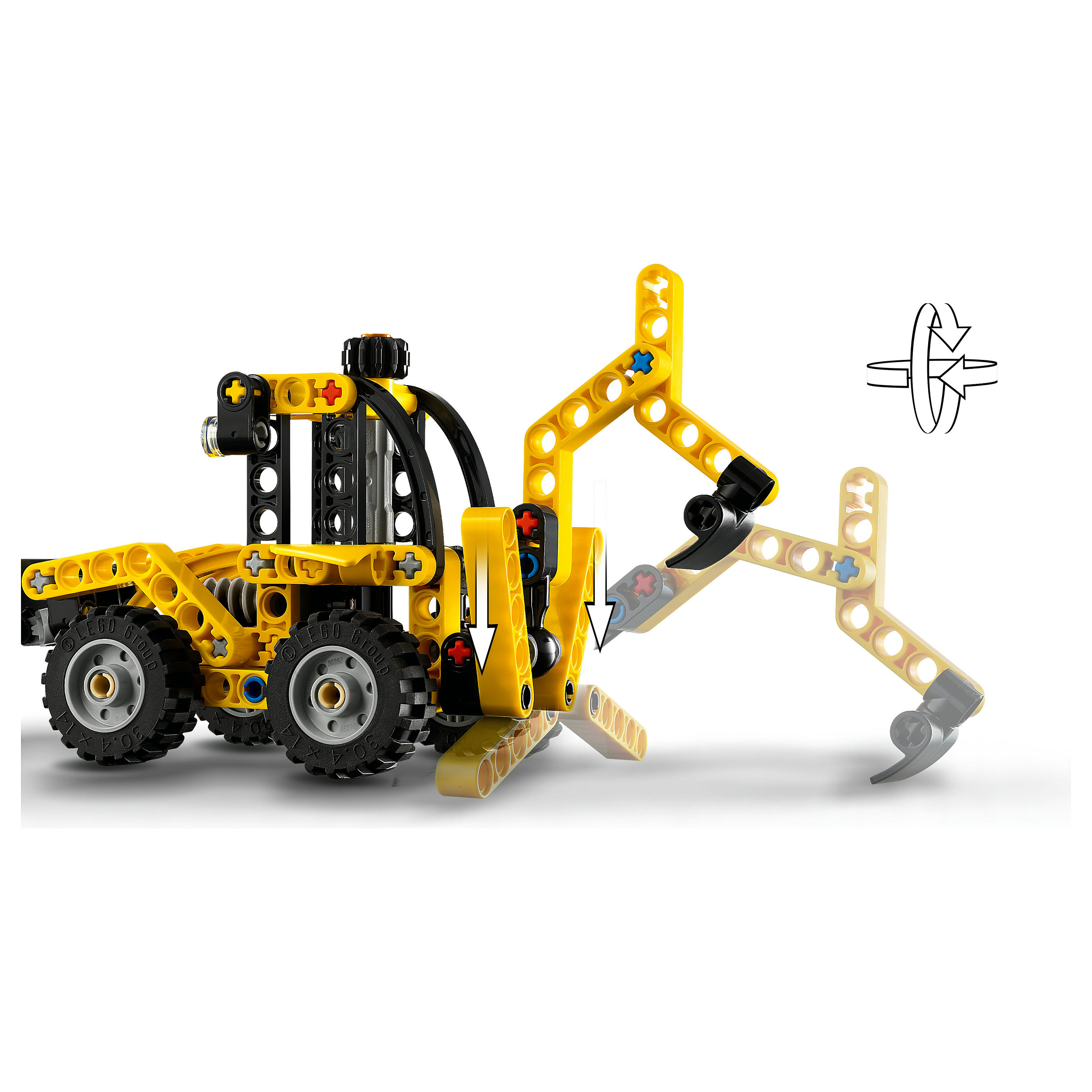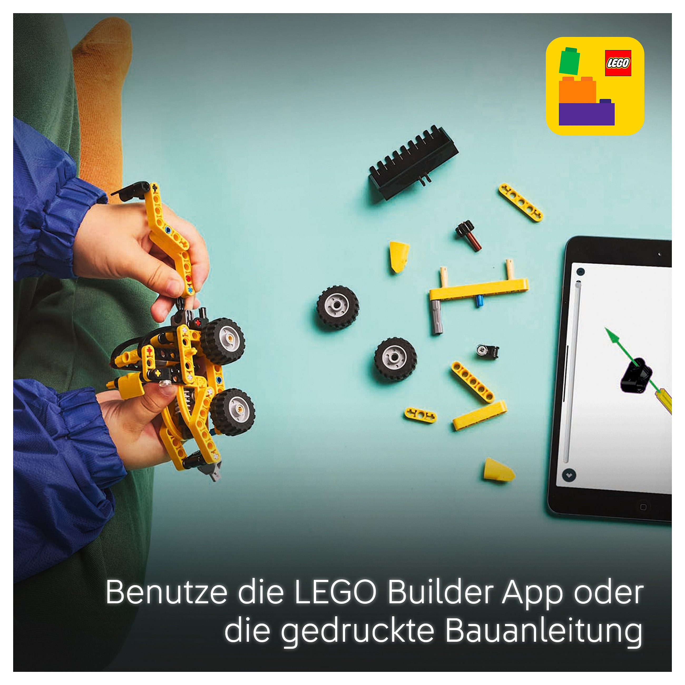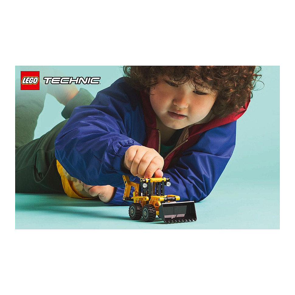 Probiere die vordere und hintere Schaufel aus: Der LEGO® Technic Baggerlader verfügt neben einer Heckschaufel und Stützfüßen auch über eine vordere Schaufel, die man mithilfe des Knaufs anheben oder absenken kann