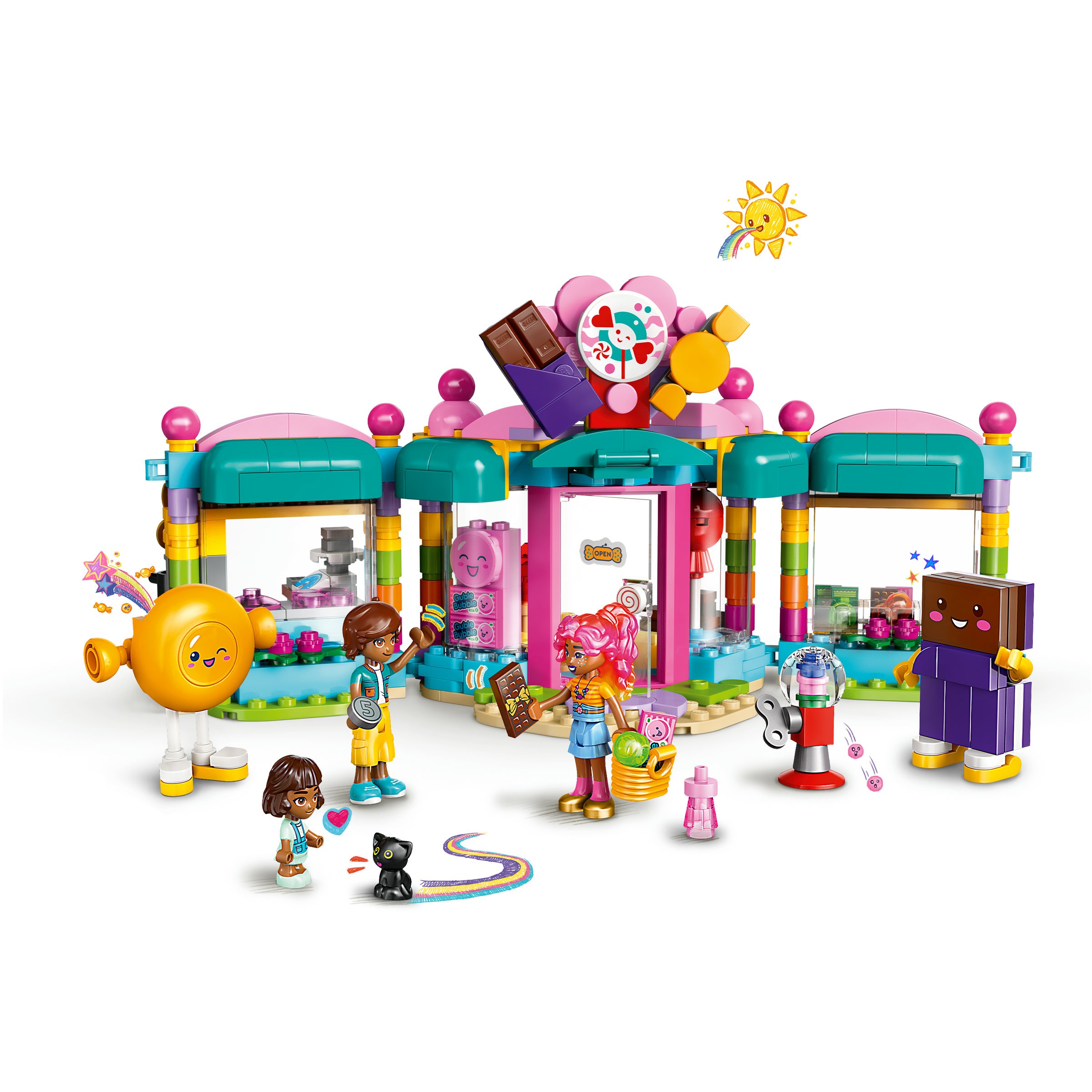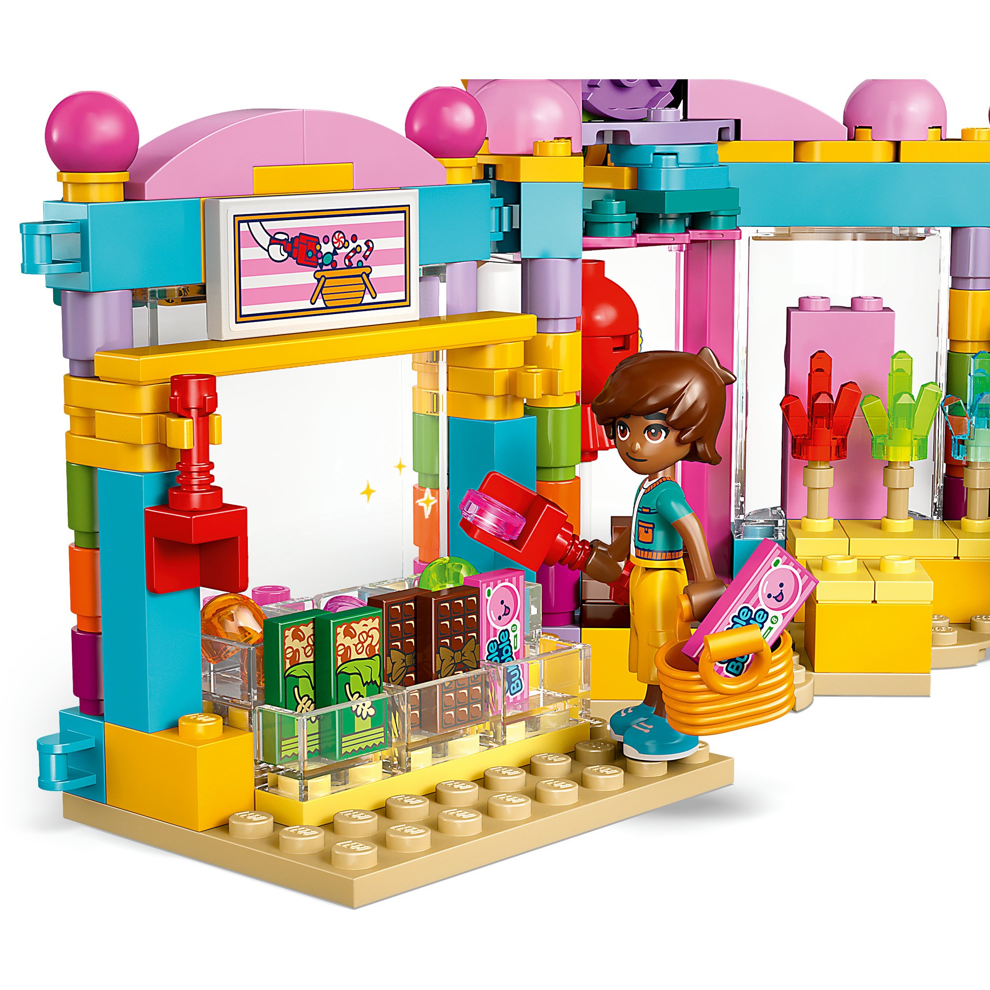Das Set ist ein tolles Spielzeug, um Kinder in ihrer sozialen Entwicklung zu fördern. Junge Baumeister können Kundeninteraktionen oder Geschwistergeschichten mit Leo und seiner kleinen Schwester Alba darstellen. Elemente wie die Auswahl für eigene Mischungen, der Riesenlutscher, der Kaugummiautomat und die Kasse laden zum Spielen im Süßwarenladen ein. In einer Ecke befinden sich Zutaten, ein Kochtopf und eine Schere, um selber Bonbons herzustellen. Und den beiden Maskottchen des Ladens – einem Schokoriegel und einem Bonbon – muss man einfach zuwinken.