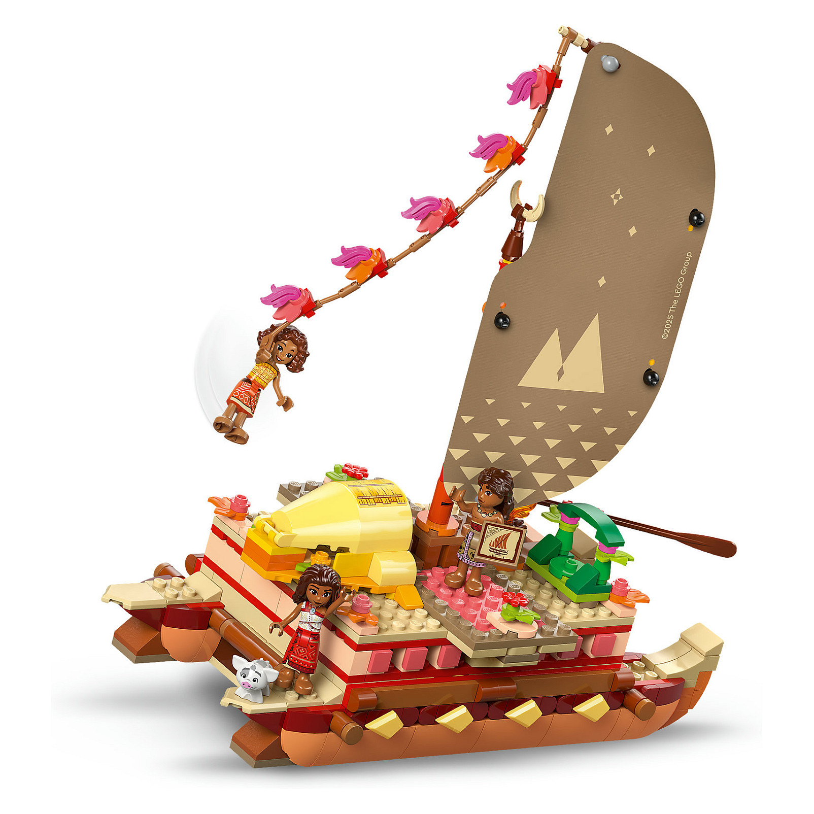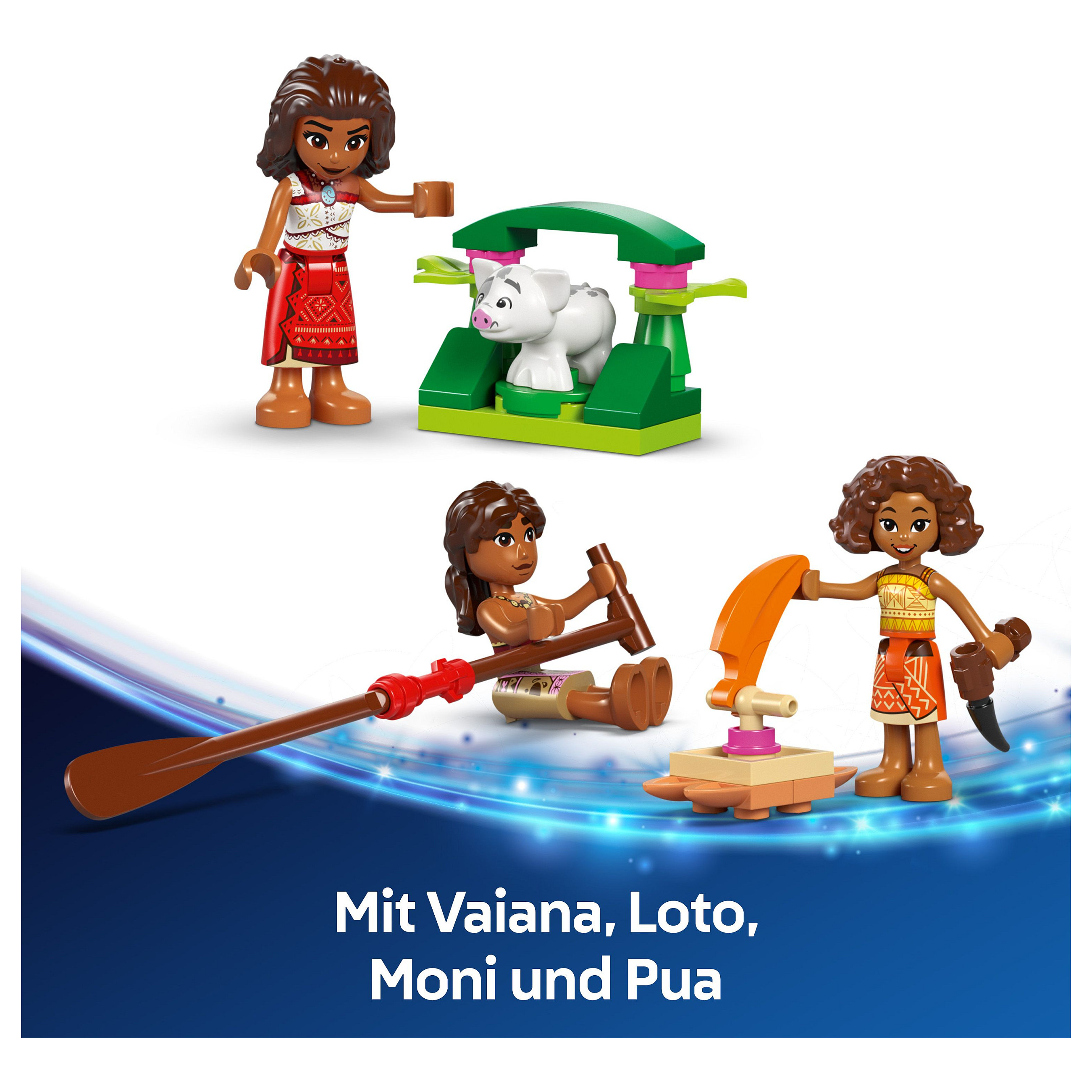 Disney Spielset: Das baubare Zweirumpfboot hat unter anderem ein lei hulu-Seil zum Feststellen der Windrichtung, eine kleine Hütte für das Schwein Pua und einen Unterstand für Vaiana