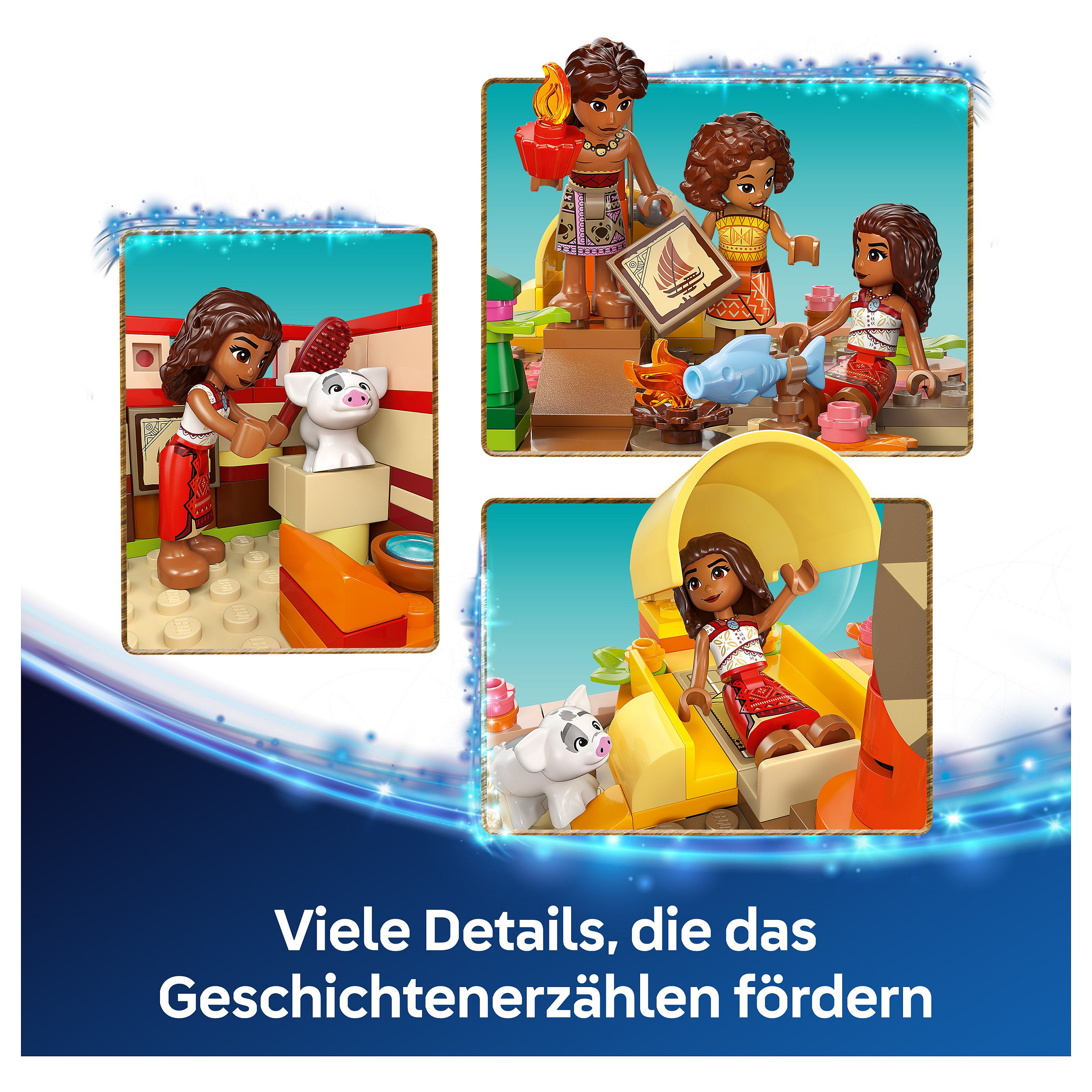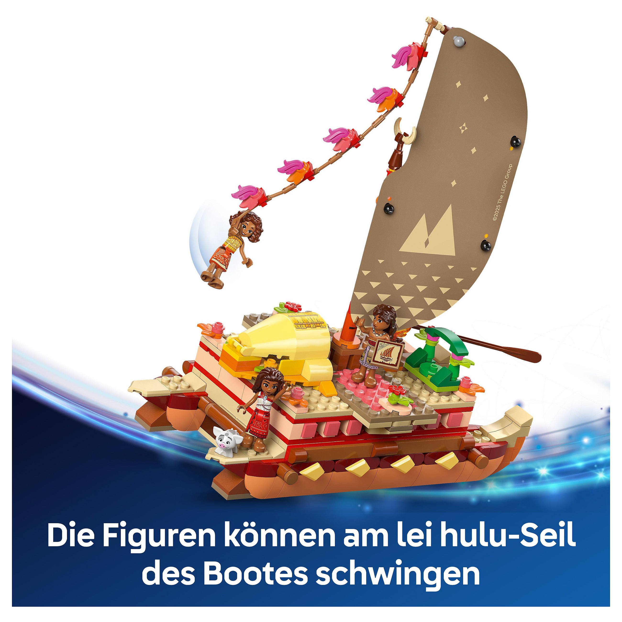 Fantasievolle Funktionen: Nimm das Oberdeck ab, um den Bereich unter Deck zu erkunden, oder klettere mit Loto oder Vaiana am lei hulu-Seil hinauf, um einen besseren Blick über den Ozean zu erhalten