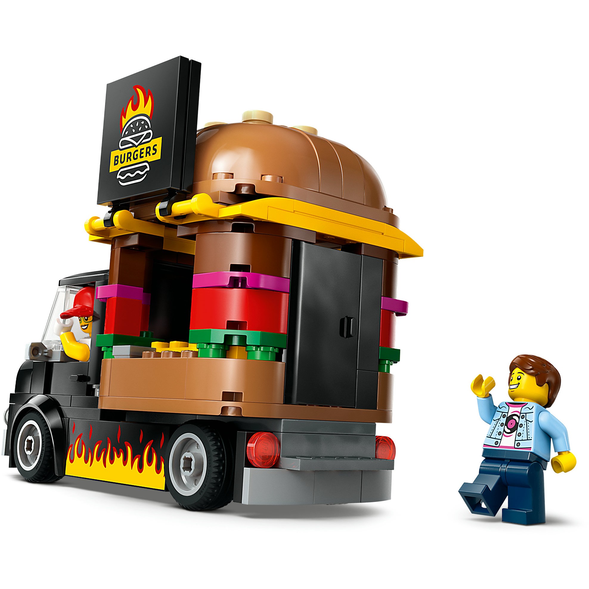 Der LEGO® City Burger-Truck (60404) ist ein cooles Spielset und eine tolle Belohnung für fantasievolle Kinder ab 5 Jahren. Auf dem Dach des mobilen Fastfood-Lokals befindet sich ein gigantischer Burger. Der Imbiss kann vom Truck abgeladen werden. Im Inneren befinden sich ein Zubereitungsbereich, Zutaten und ein Verkaufstresen. Klappt man die Luke auf, kommt das Schild mit dem auf offener Flamme gegrillten Burger zum Vorschein. Das Set beinhaltet auch 2 Minifiguren – einen Verkäufer und einen Kunden mit Cochlea-Implantat.