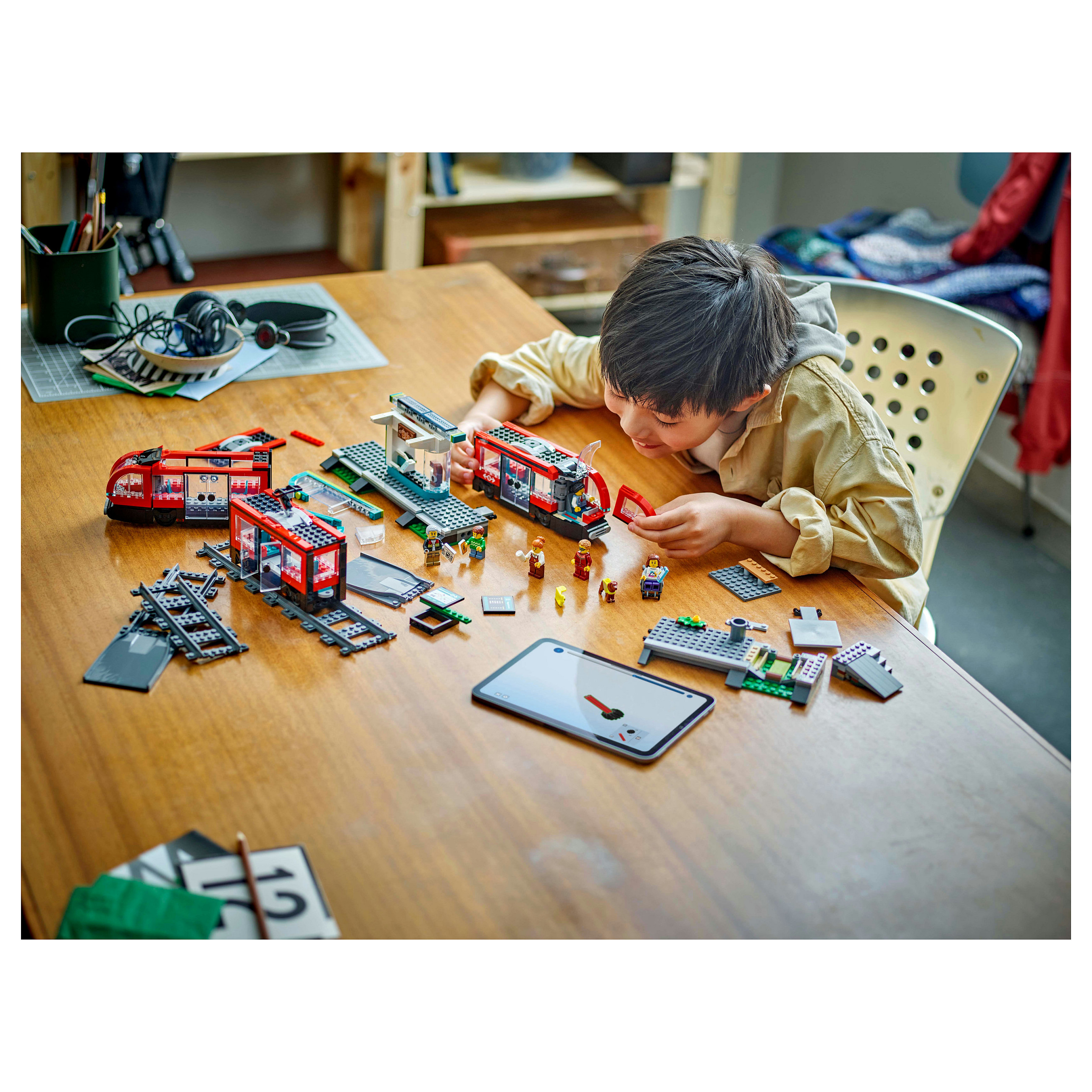 Zu diesem LEGO Straßenbahn-Spielset ist neben einer gedruckten Schritt-für-Schritt-Anleitung auch eine 3D-Bauanleitung in der LEGO Builder App verfügbar. Vergrößerungs- und Drehfunktionen lassen Kinder beim Bauen digitale Modellansichten aus jedem Winkel betrachten.