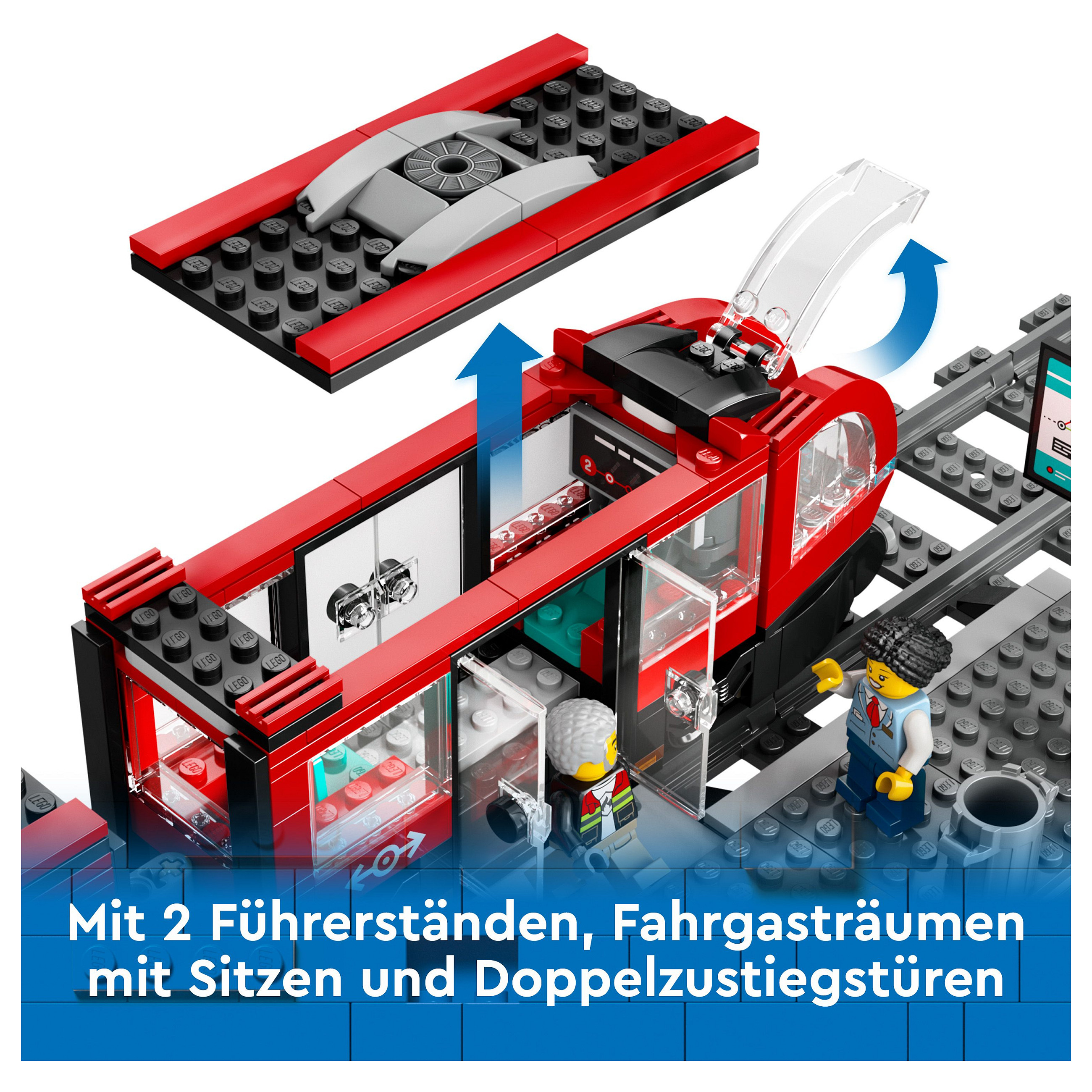 Bauspielzeuge für Kinder, die gern spielen: In der Spielzeug-Straßenbahn befinden sich Sitze für mitfahrende Minifiguren und aufschiebbare Doppeltüren. Auf dem Bahnsteig der Haltestelle erleichtern ausfahrbare Brückenplatten das Einsteigen