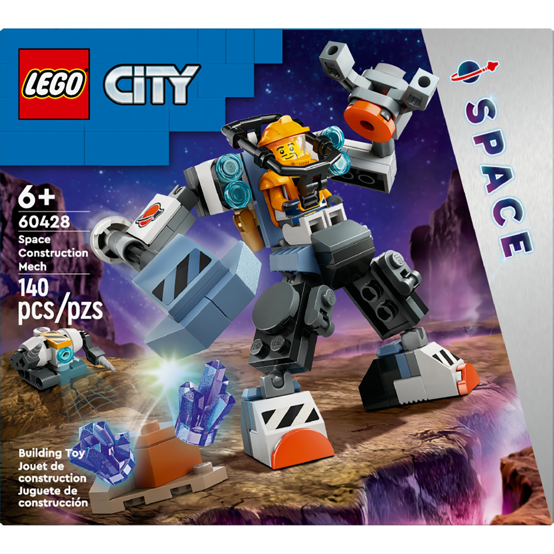 Inhalt dieses LEGO® Bausets: Alles, was Kinder brauchen, um einen beweglichen Mech, einen Weltraum-Bauroboter, eine Weltraumcrew-Minifigur und eine Planetenkulisse mit Gestein und Kristallen zu bauen