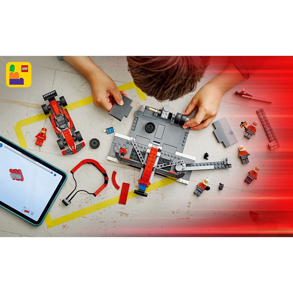 Inhalt der Box: Alles, was Kinder brauchen, um eine F1® Box und einen Ferrari Flitzer zu bauen, sowie 5 Minifiguren – 1 Rennfahrer und 4 Boxencrew-Mechaniker