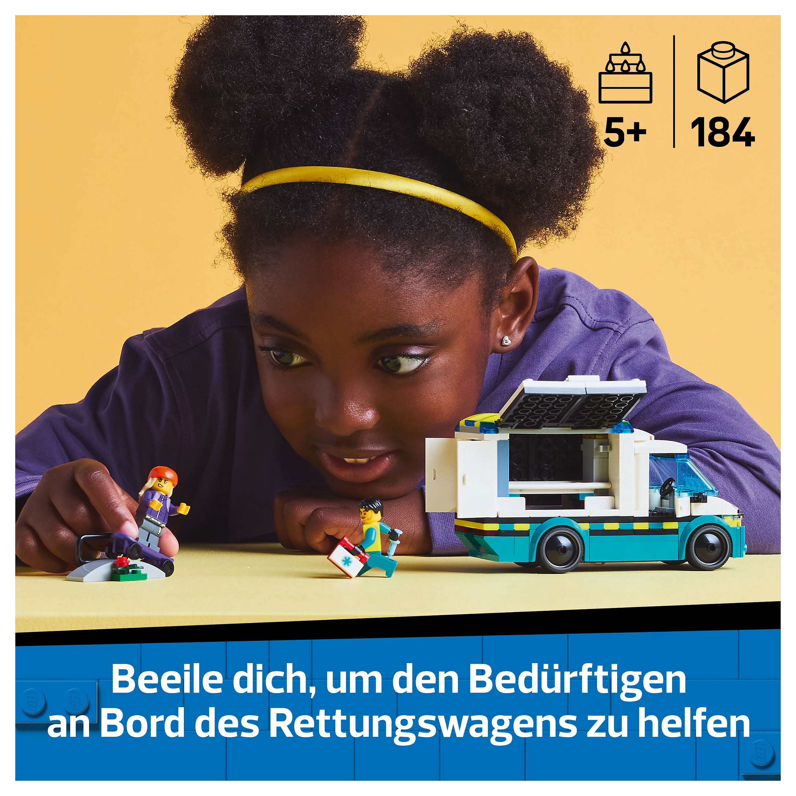 Spielzeug-Rettungswagen für Kinder ab 5 Jahren: Der LEGO® City Rettungswagen lädt zu spannenden Rettungseinsätzen ein. Hierfür beinhaltet das Spielset jede Menge realistische Funktionen