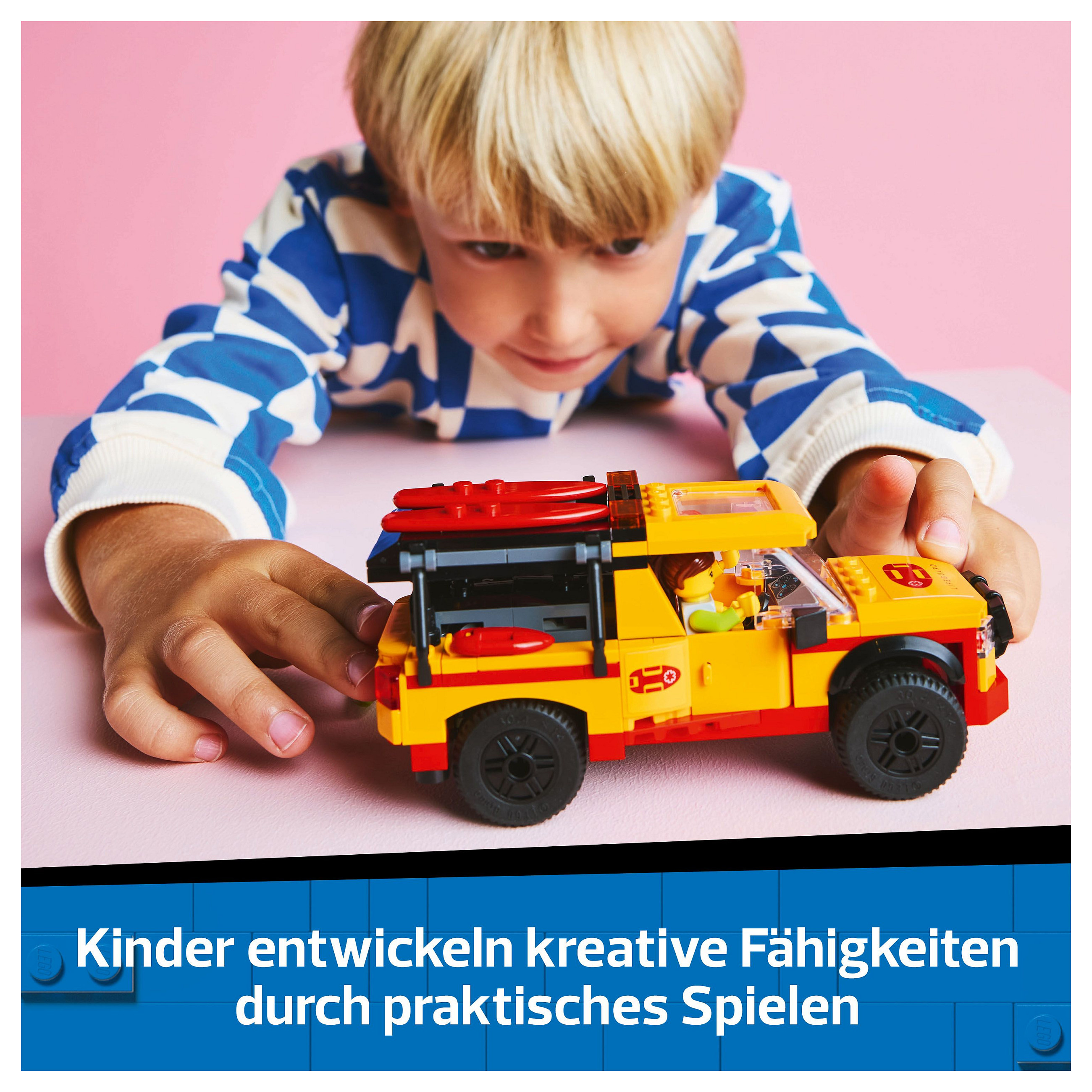LEGO® Spielzeug-Geländewagen mit coolem Zubehör: Dieses Spielset für Kinder beinhaltet 3 Surfbretter, 2 Rettungsbojen, Schwimmflossen, ein Fernglas, ein Megafon, eine Wasserflasche, ein Handy und einen Erste-Hilfe-Kasten