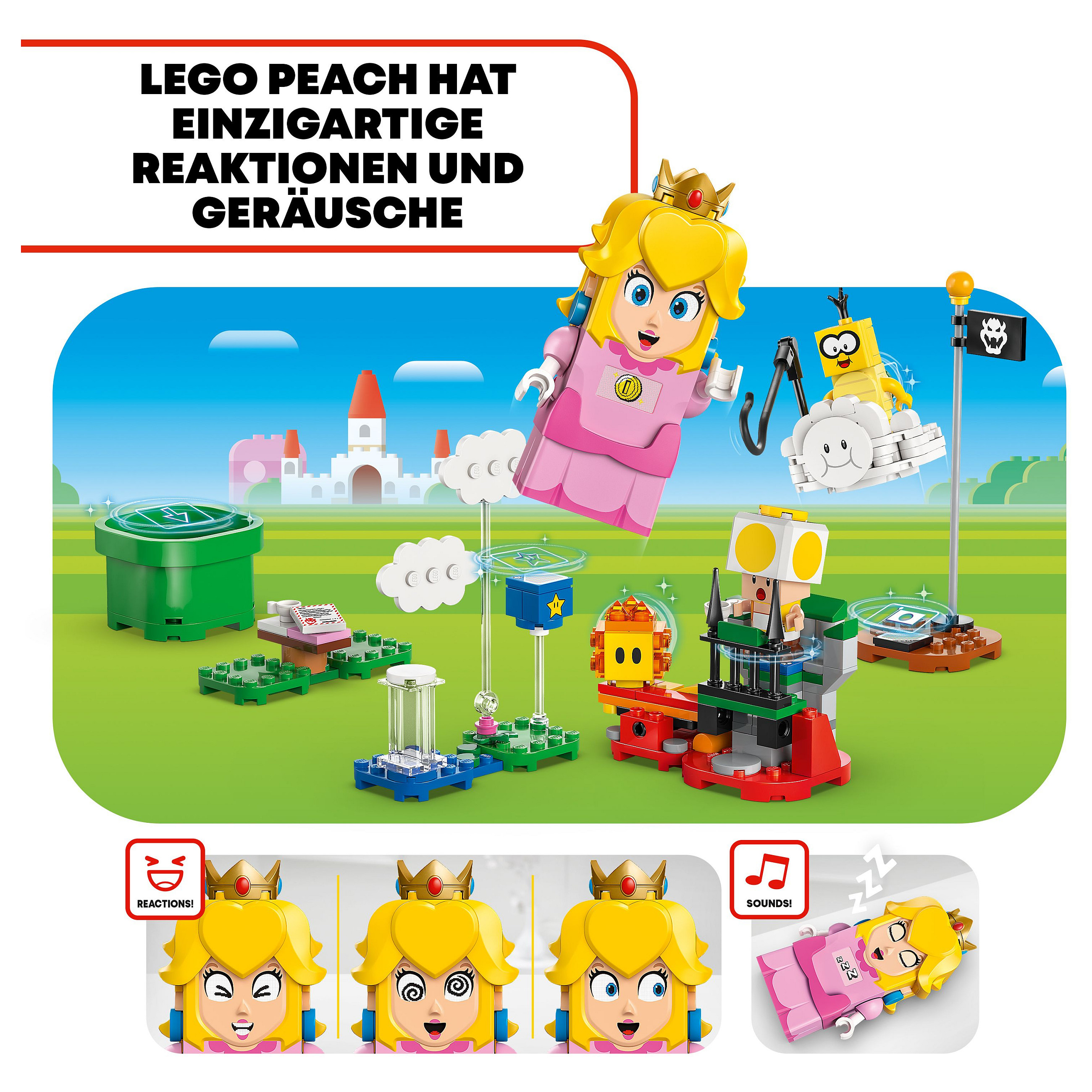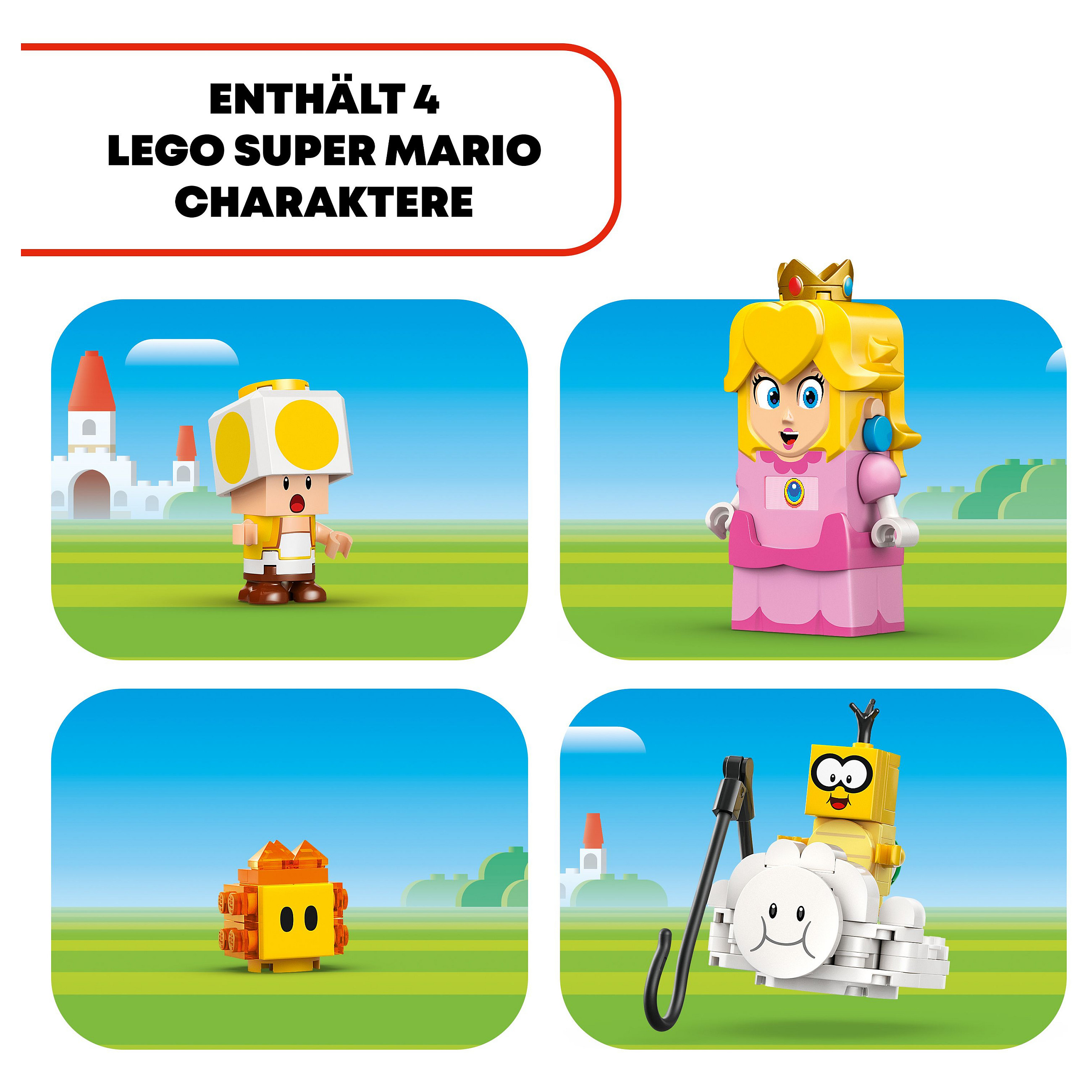4 LEGO® Super Mario™ Figuren: Dieses Nintendo® Set beinhaltet die interaktive LEGO® Peach™ sowie drei weitere Spielzeugfiguren – Lakitu, einen gelben Toad und einen Hothead