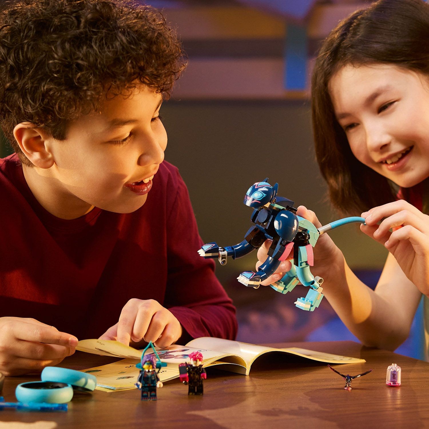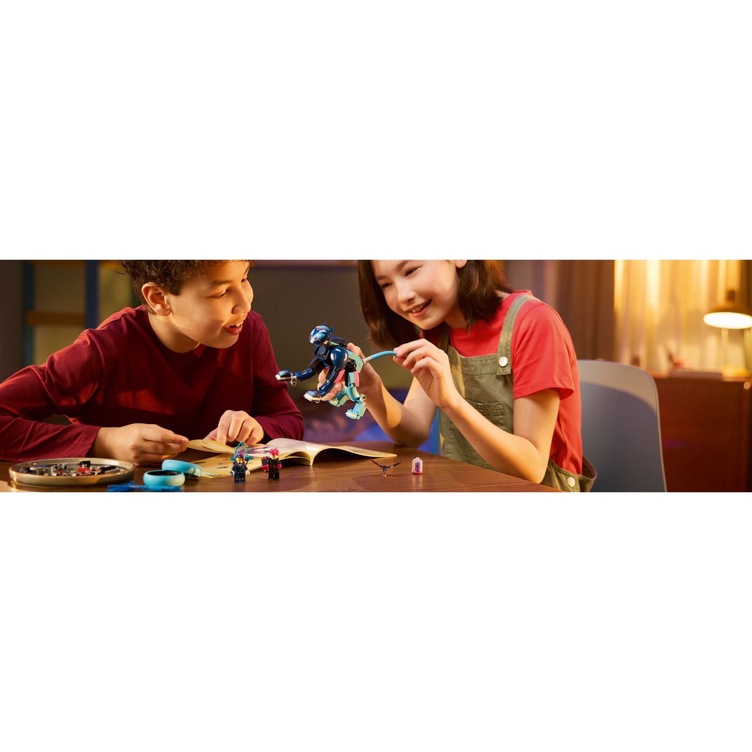 Zoey und Dooper: 2 LEGO® DREAMZzz™ Minifiguren laden zu packenden Actionabenteuern ein. Eine davon ist Zoey, die man auf den Rücken der Katze setzen kann. Sie hält einen schießenden Bogen in der Hand