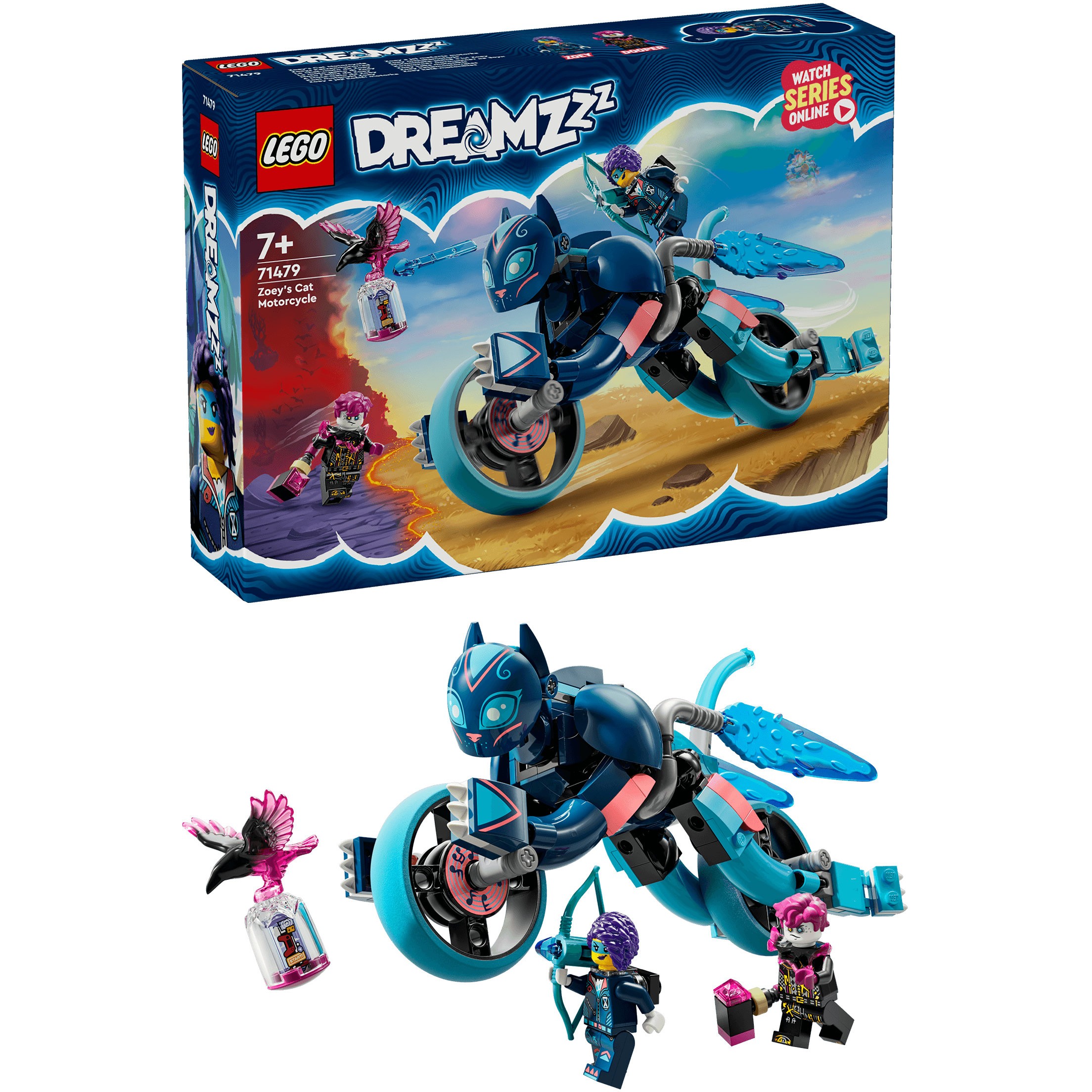 LEGO® DREAMZzz™ Zoeys Katzenmotorrad (71479) ist ein Spielzeugbike, das die Fantasie weckt. Die Spielzeugkatze zum Umbauen basiert auf der TV-Serie. Jungen und Mädchen ab 7 Jahren können auf diesem coolen LEGO Bike in die Traumwelt düsen.
