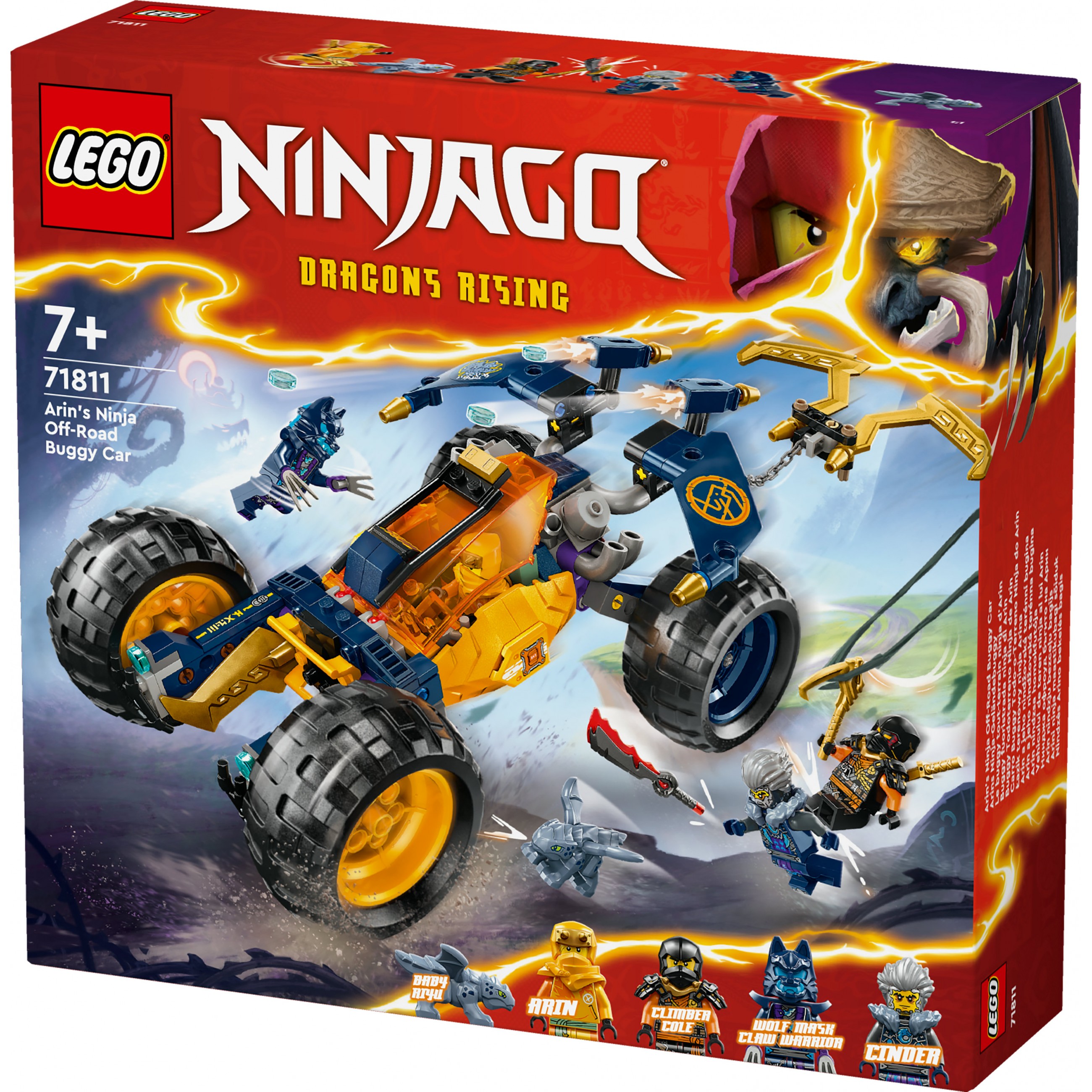 LEGO® NINJAGO Arins Ninja-Geländebuggy (71811) lässt Jungen und Mädchen ab 7 Jahren die packenden Duelle aus der 2. Staffel der TV-Serie NINJAGO® Aufstieg der Drachen nachstellen. Dieses Abenteuerset für Kinder beinhaltet ein gelbes Spielzeugauto mit beweglichen Rädern, Federung, aufklappbarem Cockpit und Platz für 2 Minifiguren. 2 sechsschüssige Shooter und ein großer Haken am Heck helfen dir, die Bösewichte zu fangen.