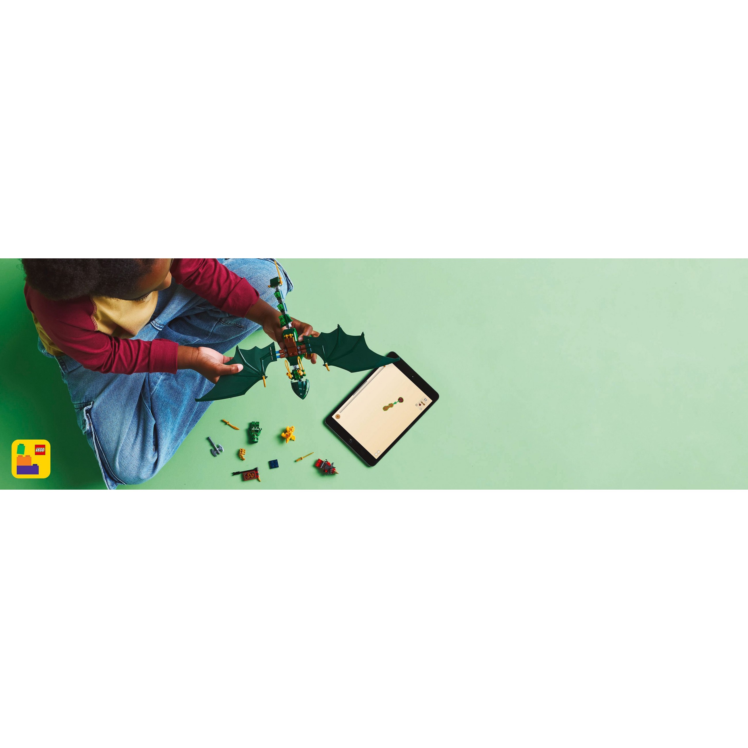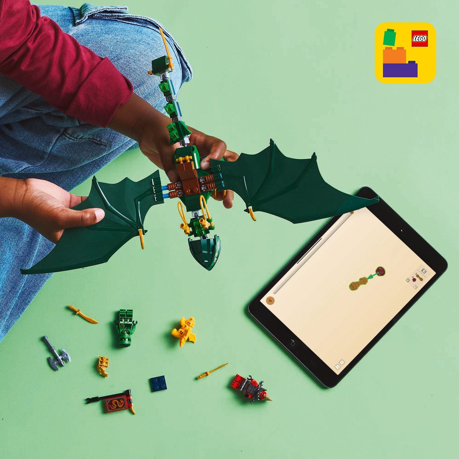 Beweglicher NINJAGO® Drache: Lloyds grüner Walddrache ist ein baubares Modell, das Schwanz, Hals, Beine, Hände und Flügel bewegen kann. Der Drache trägt einen Sattel auf dem Rücken, damit eine Minifigur auf ihm reiten kann